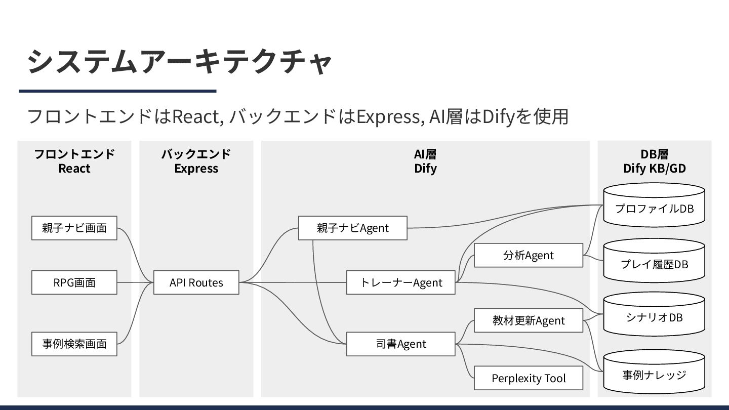 Express 親⼦ナビ画⾯ RPG画⾯ 事例検索画⾯ API Routes AI層 Dify 親⼦ナビAgent トレーナーAgent 司書Agent 教材更新Agent 分析Agent 事例ナレッジ Perplexity Tool シナリオDB プレイ履歴DB プロファイルDB