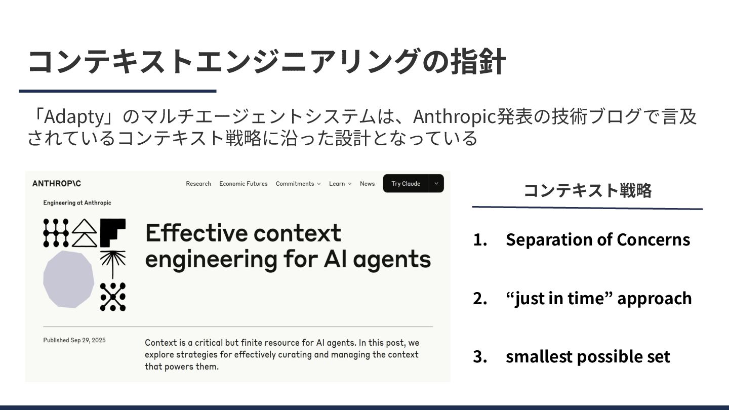 コンテキストエンジニアリングの指針 「Adapty」のマルチエージェントシステムは、Anthropic発表の技術ブログで⾔及 されているコンテキスト戦略に沿った設計となっている 1. Separation of Concerns 2. “just in