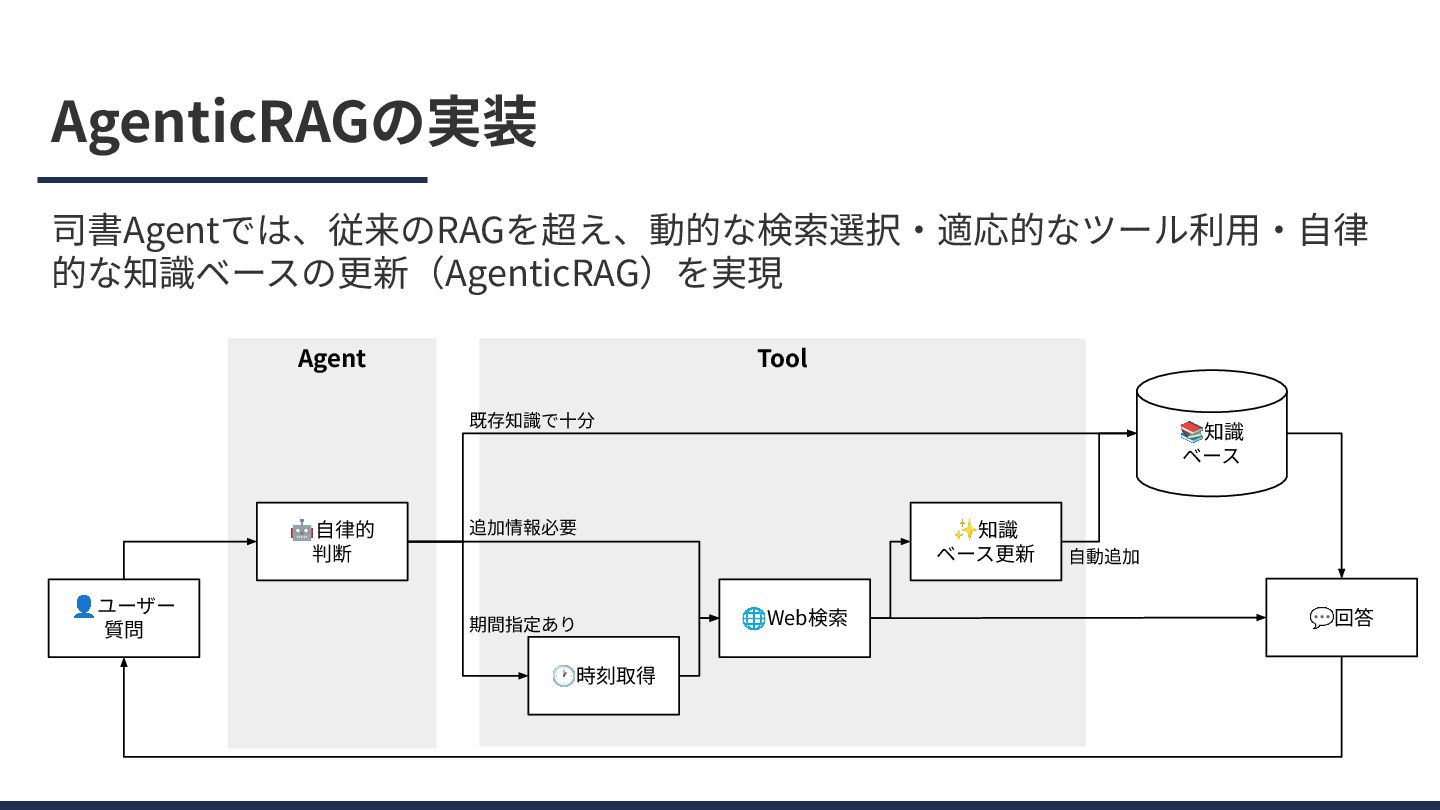 AgenticRAGの実装 司書Agentでは、従来のRAGを超え、動的な検索選択‧適応的なツール利⽤‧⾃律 的な知識ベースの更新(AgenticRAG)を実現 Tool Agent 👤ユーザー 質問 🕐時刻取得 🌐Web検索 ✨知識