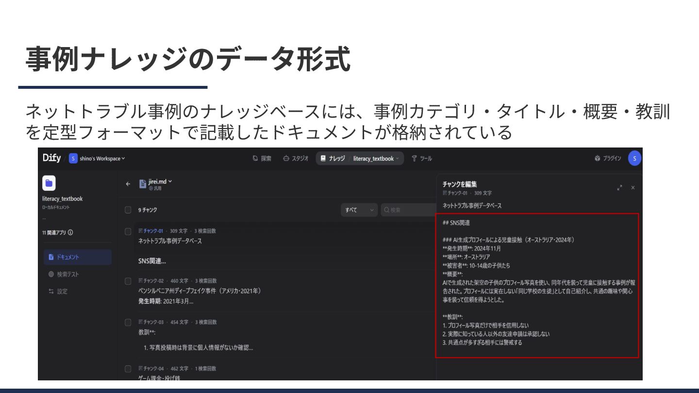 事例ナレッジのデータ形式 ネットトラブル事例のナレッジベースには、事例カテゴリ‧タイトル‧概要‧教訓 を定型フォーマットで記載したドキュメントが格納されている
