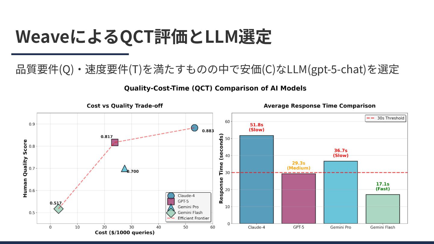 WeaveによるQCT評価とLLM選定 品質要件(Q)‧速度要件(T)を満たすものの中で安価(C)なLLM(gpt-5-chat)を選定