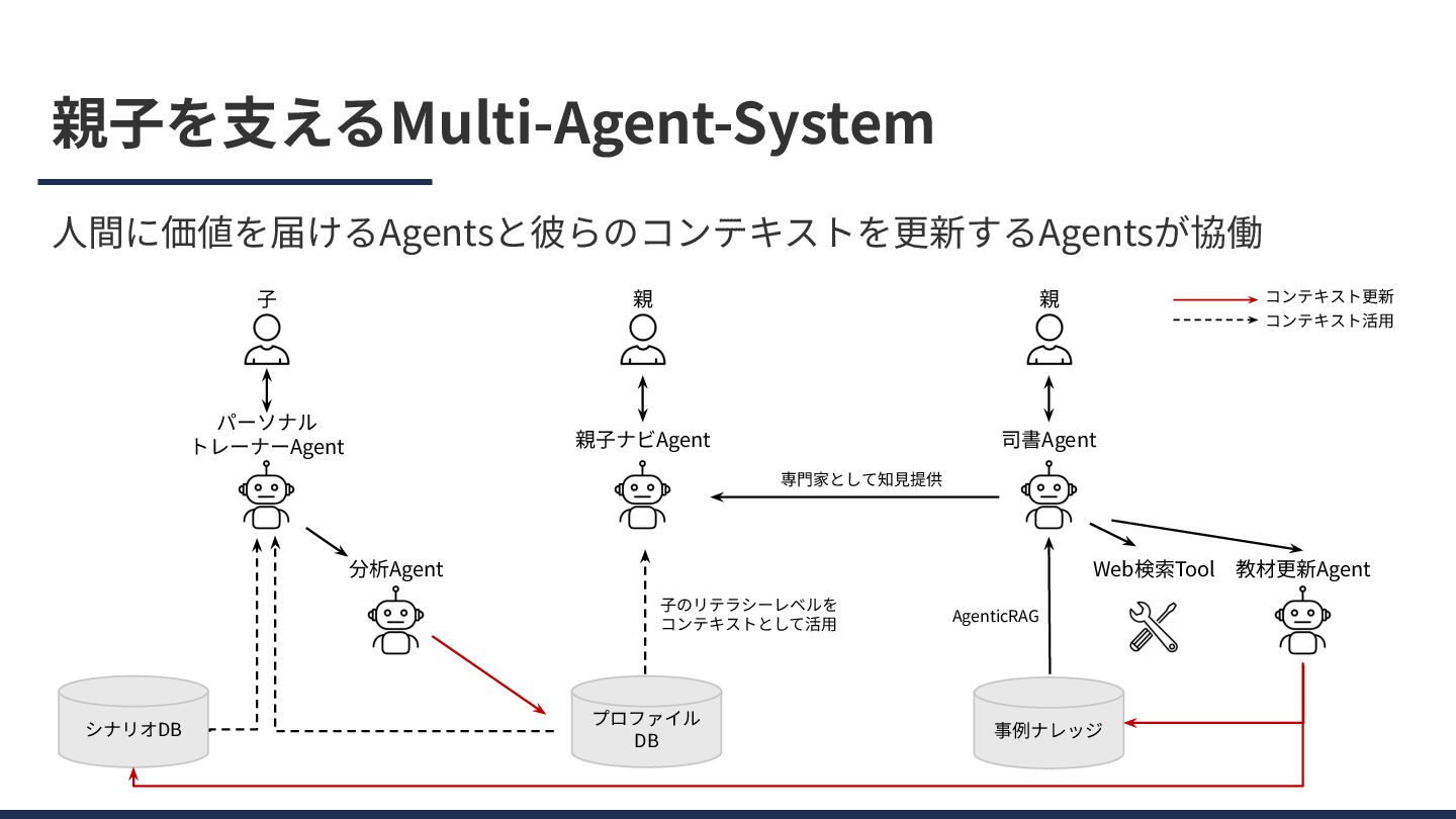 親⼦を⽀えるMulti-Agent-System ⼈間に価値を届けるAgentsと彼らのコンテキストを更新するAgentsが協働 親⼦ナビAgent 親 プロファイル DB 司書Agent 専⾨家として知⾒提供 事例ナレッジ Web検索Tool