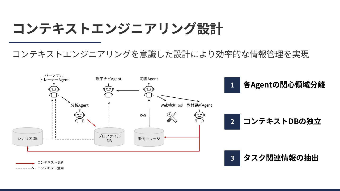コンテキストエンジニアリング設計 コンテキストエンジニアリングを意識した設計により効率的な情報管理を実現 教材更新Agent 親⼦ナビAgent プロファイル DB 司書Agent 事例ナレッジ Web検索Tool パーソナル