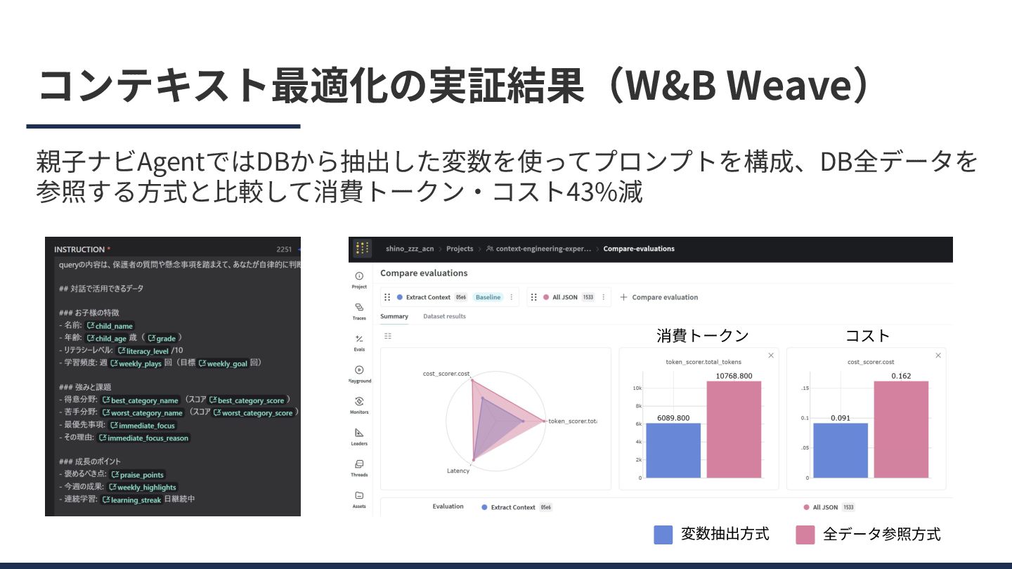 コンテキスト最適化の実証結果(W&B Weave) 親⼦ナビAgentではDBから抽出した変数を使ってプロンプトを構成、DB全データを 参照する⽅式と⽐較して消費トークン‧コスト43%減 全データ参照⽅式 変数抽出⽅式 消費トークン コスト