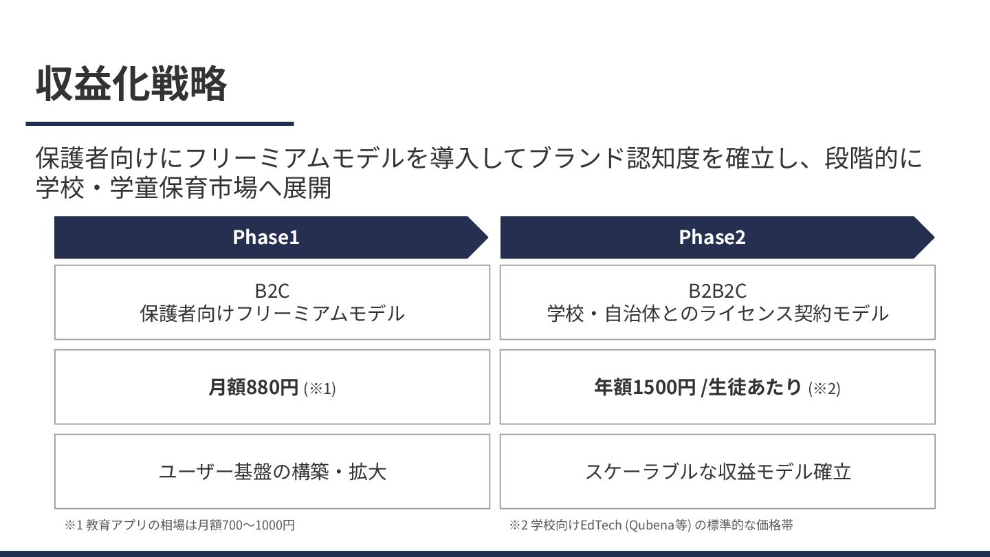 (※1) 年額1500円 /⽣徒あたり (※2) ユーザー基盤の構築‧拡⼤ スケーラブルな収益モデル確⽴ ※1 教育アプリの相場は⽉額700〜1000円 ※2 学校向けEdTech (Qubena等) の標準的な価格帯