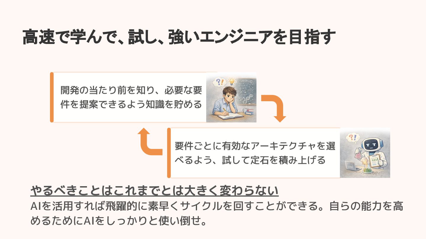 高速で学んで、試し、強いエンジニアを目指す 開発の当たり前を知り、必要な要 件を提案できるよう知識を貯める 要件ごとに有効なアーキテクチャを選 べるよう、試して定石を積み上げる やるべきことはこれまでとは大きく変わらない AIを活用すれば飛躍的に素早くサイクルを回すことができる。自らの能力を高 めるためにAIをしっかりと使い倒せ。