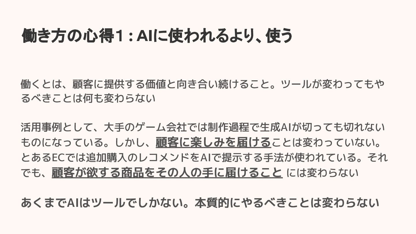働くとは、顧客に提供する価値と向き合い続けること。ツールが変わってもや るべきことは何も変わらない 活用事例として、大手のゲーム会社では制作過程で生成AIが切っても切れない ものになっている。しかし、顧客に楽しみを届けることは変わっていない。 とあるECでは追加購入のレコメンドをAIで提示する手法が使われている。それ でも、顧客が欲する商品をその人の手に届けること には変わらない あくまでAIはツールでしかない。本質的にやるべきことは変わらない 働き方の心得1 :