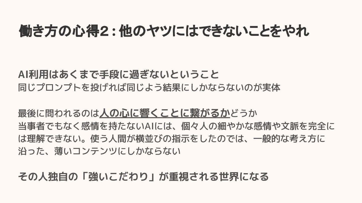 働き方の心得2 : 他のヤツにはできないことをやれ AI利用はあくまで手段に過ぎないということ 同じプロンプトを投げれば同じよう結果にしかならないのが実体 最後に問われるのは人の心に響くことに繋がるかどうか 当事者でもなく感情を持たないAIには、個々人の細やかな感情や文脈を完全に は理解できない。使う人間が横並びの指示をしたのでは、一般的な考え方に 沿った、薄いコンテンツにしかならない その人独自の「強いこだわり」が重視される世界になる