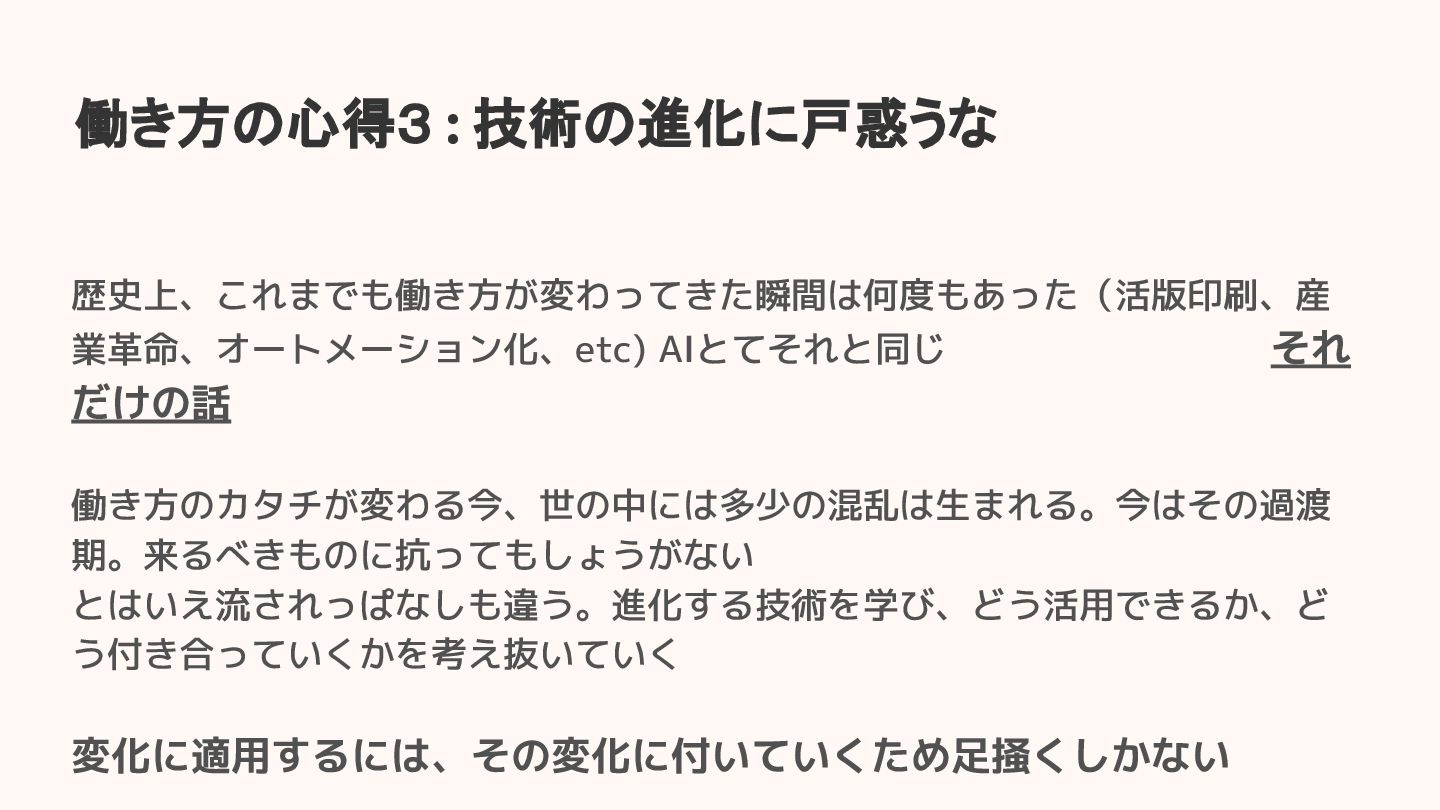働き方の心得3 : 技術の進化に戸惑うな 歴史上、これまでも働き方が変わってきた瞬間は何度もあった(活版印刷、産 業革命、オートメーション化、etc) AIとてそれと同じ。働き方が変わる、それ だけの話 働き方のカタチが変わる今、世の中には多少の混乱は生まれる。今はその過渡 期。来るべきものに抗ってもしょうがない とはいえ流されっぱなしも違う。進化する技術を学び、どう活用できるか、ど