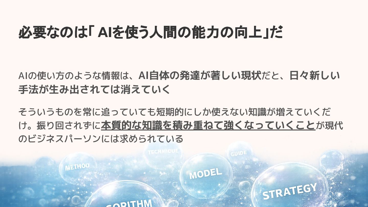 必要なのは「 AIを使う人間の能力の向上」だ AIの使い方のような情報は、AI自体の発達が著しい現状だと、日々新しい 手法が生み出されては消えていく そういうものを常に追っていても短期的にしか使えない知識が増えていくだ け。振り回されずに本質的な知識を積み重ねて強くなっていくことが現代 のビジネスパーソンには求められている