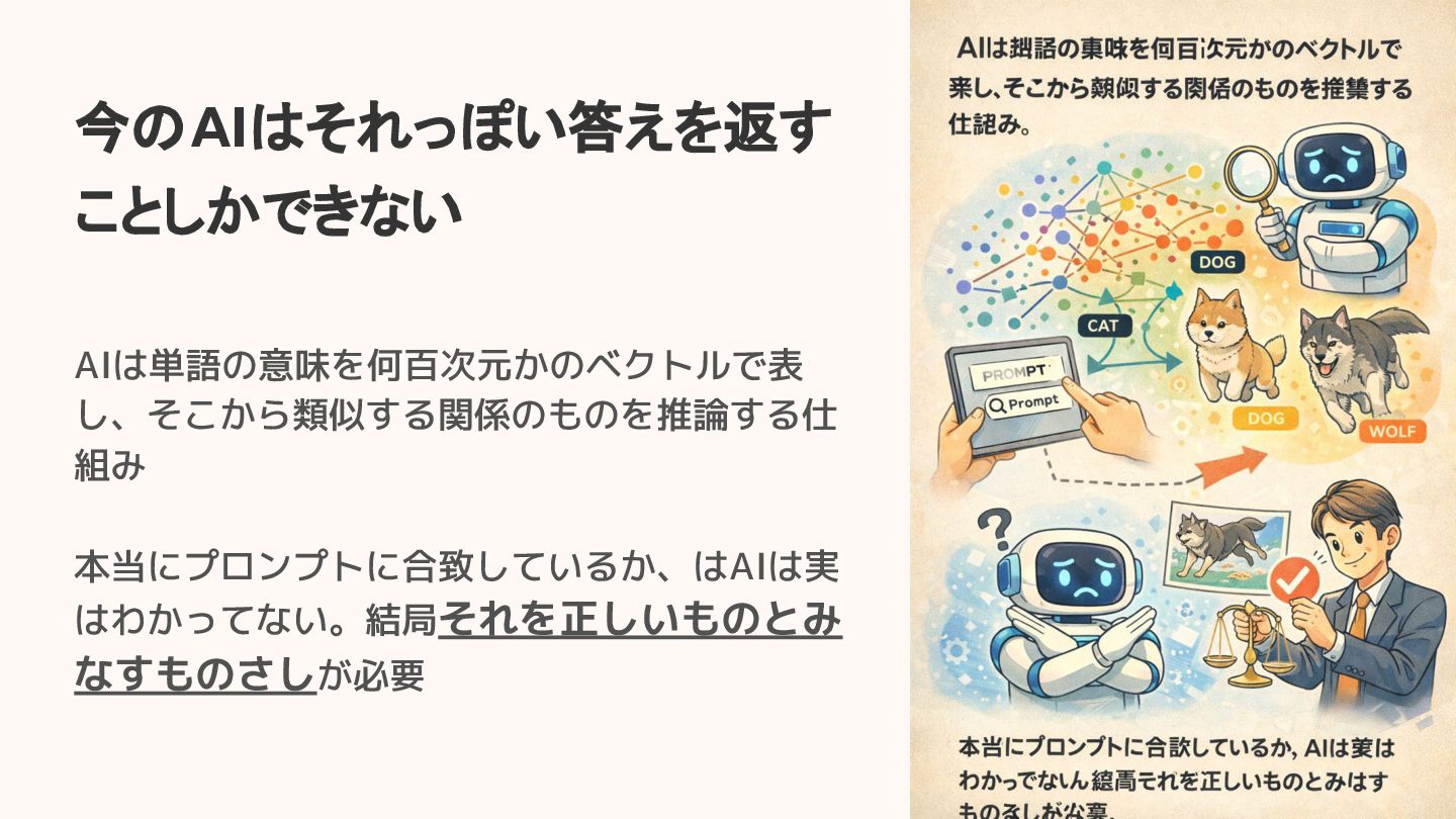 今のAIはそれっぽい答えを返す ことしかできない AIは単語の意味を何百次元かのベクトルで表 し、そこから類似する関係のものを推論する仕 組み 本当にプロンプトに合致しているか、はAIは実 はわかってない。結局それを正しいものとみ なすものさしが必要