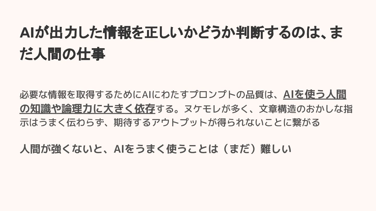 AIが出力した情報を正しいかどうか判断するのは、ま だ人間の仕事 必要な情報を取得するためにAIにわたすプロンプトの品質は、AIを使う人間 の知識や論理力に大きく依存する。ヌケモレが多く、文章構造のおかしな指 示はうまく伝わらず、期待するアウトプットが得られないことに繋がる 人間が強くないと、AIをうまく使うことは(まだ)難しい