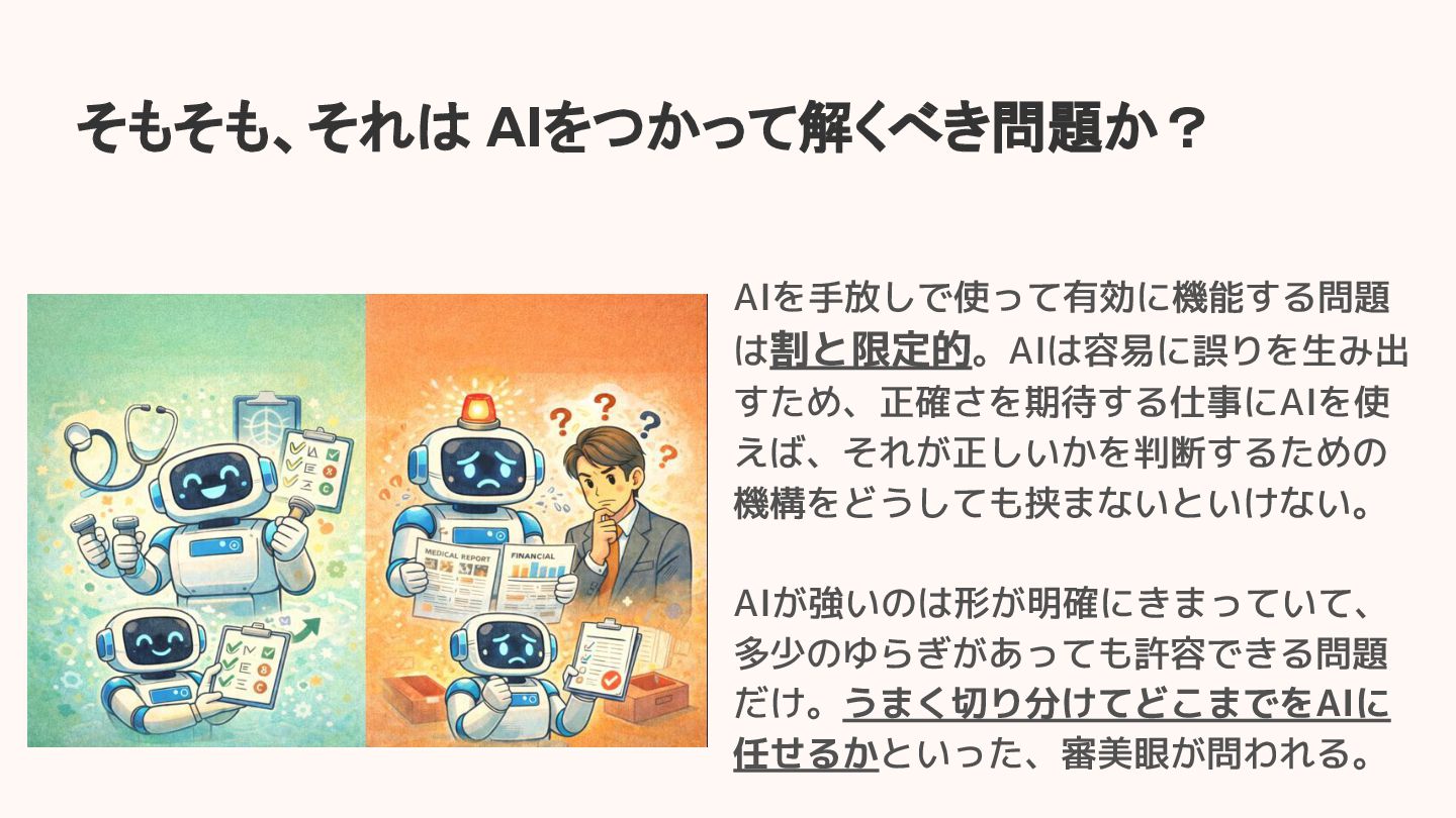 AIを手放しで使って有効に機能する問題 は割と限定的。AIは容易に誤りを生み出 すため、正確さを期待する仕事にAIを使 えば、それが正しいかを判断するための 機構をどうしても挟まないといけない。 AIが強いのは形が明確にきまっていて、 多少のゆらぎがあっても許容できる問題 だけ。うまく切り分けてどこまでをAIに 任せるかといった、審美眼が問われる。 そもそも、それは