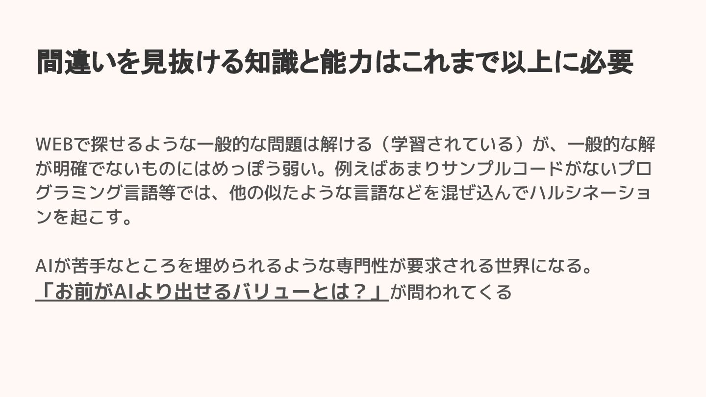 WEBで探せるような一般的な問題は解ける(学習されている)が、一般的な解 が明確でないものにはめっぽう弱い。例えばあまりサンプルコードがないプロ グラミング言語等では、他の似たような言語などを混ぜ込んでハルシネーショ ンを起こす。 AIが苦手なところを埋められるような専門性が要求される世界になる。 「お前がAIより出せるバリューとは?」が問われてくる 間違いを見抜ける知識と能力はこれまで以上に必要