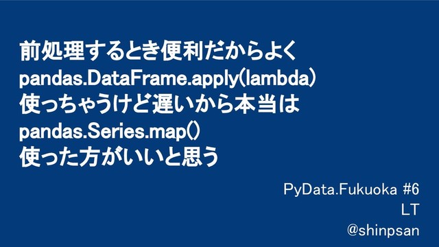 前処理するとき便利だからよく pandas.DataFrame.apply(lambda) 使っちゃうけど遅いから本当は pandas.Series.map() 使った方がいいと思う PyData.Fukuoka #6 LT @shinpsan