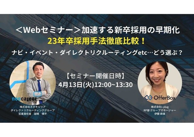 特 化 型 媒 体 掲 載 期 間 ・ ル ー ル 採 用 広 報 は 3 年 生 3 月 か ら イ ン タ ー ン シ ッ プ 3 年 生 6 月 か ら 通 年 や 卒 年 毎 で の 掲 載 イ ン タ ー ン シ ッ プ 等 の 区 切 り な し 特 徴 学 生 が 能 動 的 に エ ン ト リ ー 学 生 が 能 動 的 に エ ン ト リ ー メ リ ッ ト 母 集 団 の 数 が 圧 倒 的 に 多 い 特 定 の タ ー ゲ ッ ト に 見 て も ら え る デ メ リ ッ ト 埋 も れ て し ま う 可 能 性 が 高 い 学 生 の 登 録 数 が 少 な い コ ス ト ¥ 1 , 0 0 0 , 0 0 0 ~ ¥ 5 0 0 , 0 0 0 ~ ¥ 1 , 5 0 0 , 0 0 0 こ ん な 企 業 様 に オ ス ス メ ・ 採 用 人 数 が 多 く 、 母 集 団 の 数 が 必 要 ・ 幅 広 い 学 生 に 知 っ て も ら い た い ・ 人 気 業 界 で エ ン ト リ ー が 集 め や す い ・ 特 定 の タ ー ゲ ッ ト の み を 集 め た い ・ カ ル チ ャ ー や 職 務 適 正 で 見 極 め た い ・ ス カ ウ ト メ ー ル で 直 接 ア プ ロ ー チ し た い