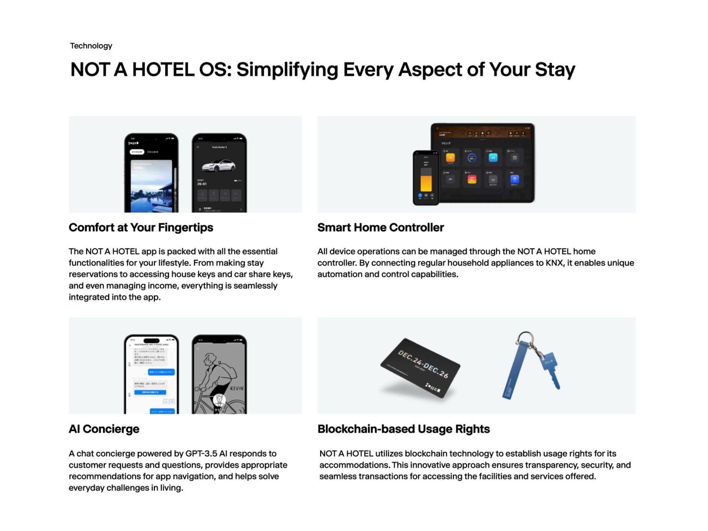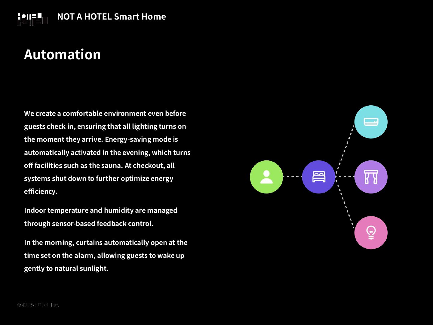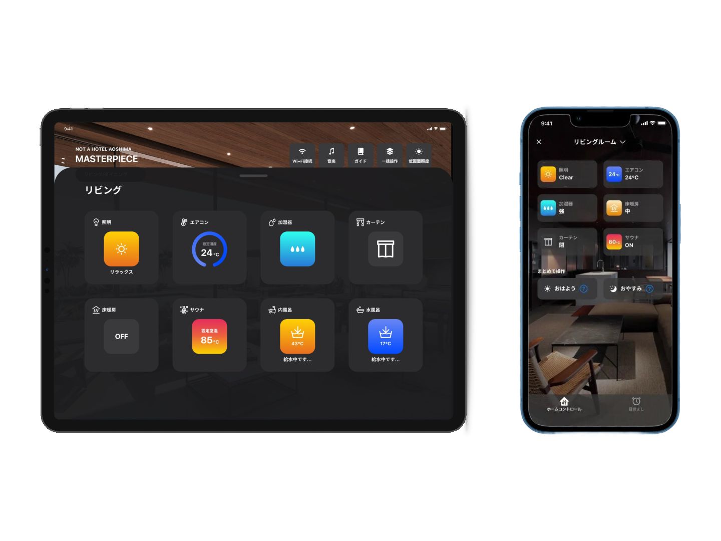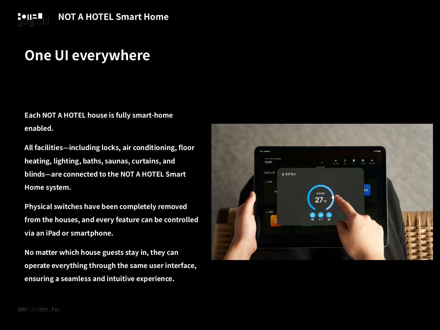 facilities—including locks, air conditioning, floor heating, lighting, baths, saunas, curtains, and blinds—are connected to the NOT A HOTEL Smart Home system. Physical switches have been completely removed from the houses, and every feature can be controlled via an iPad or smartphone. No matter which house guests stay in, they can operate everything through the same user interface, ensuring a seamless and intuitive experience. NOT A HOTEL Smart Home One UI everywhere