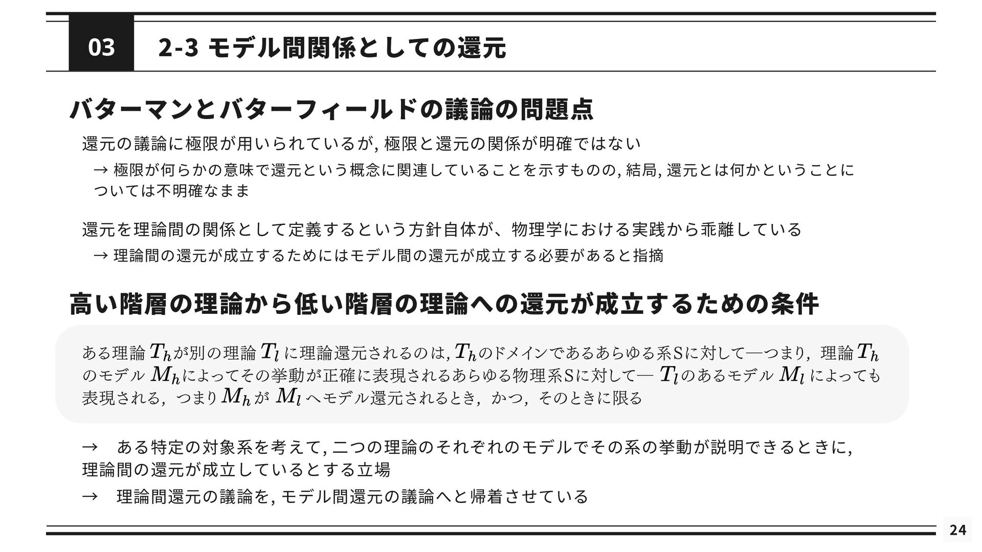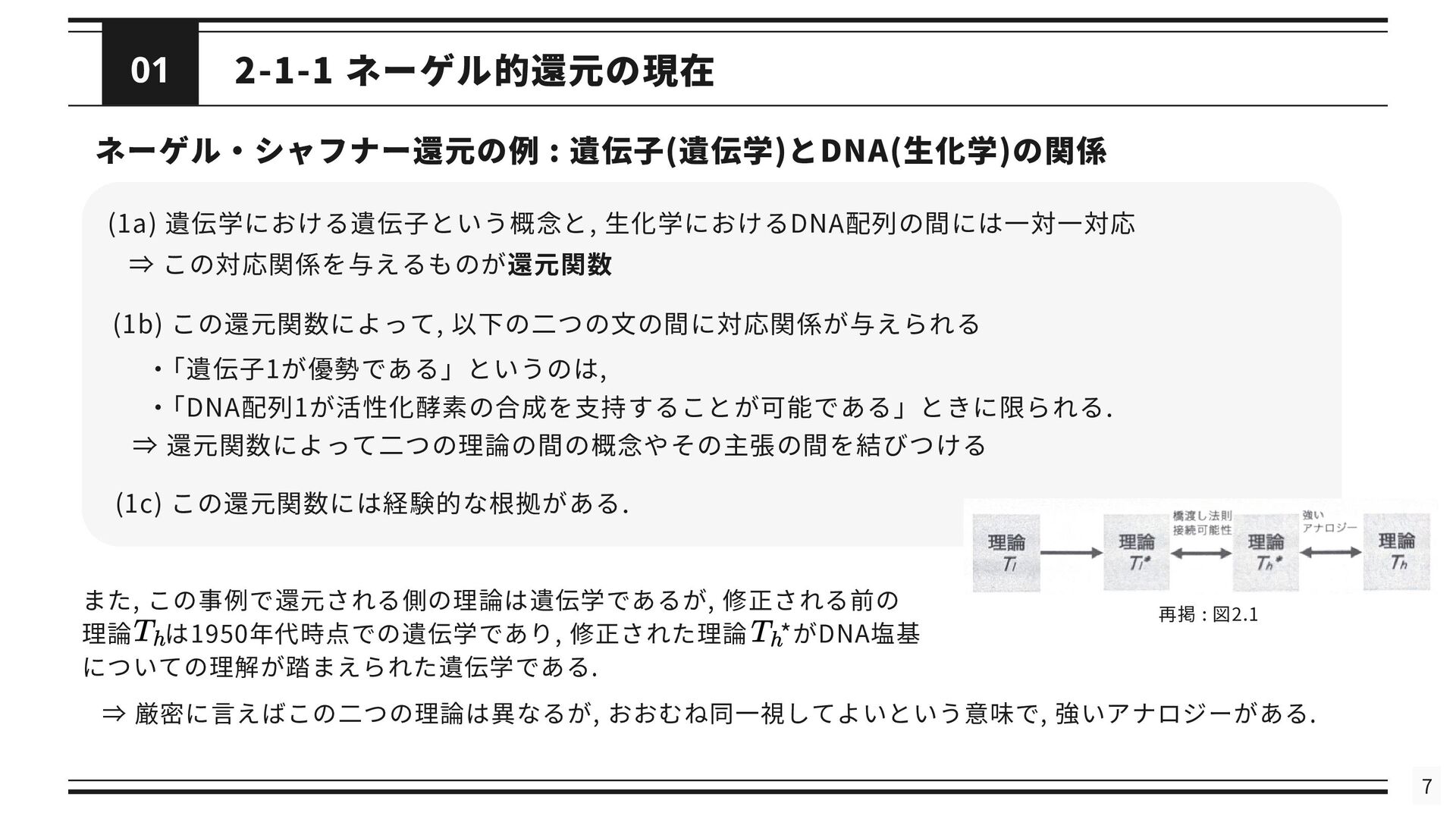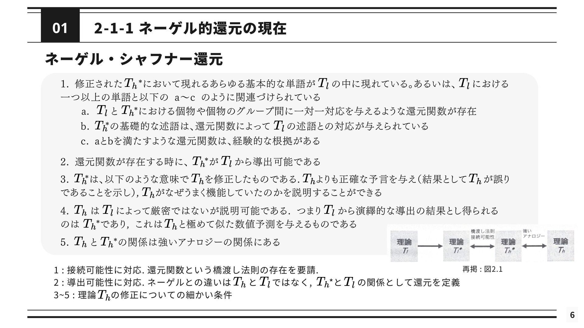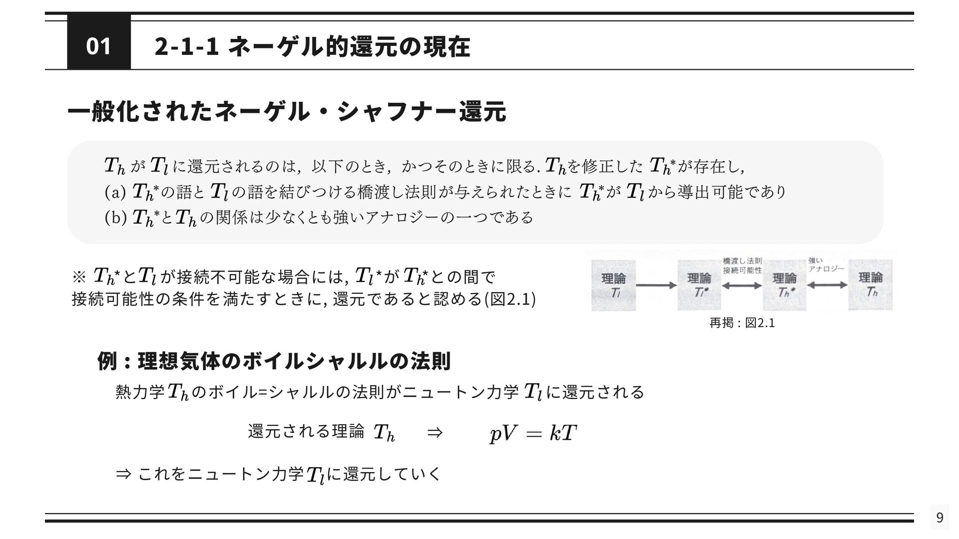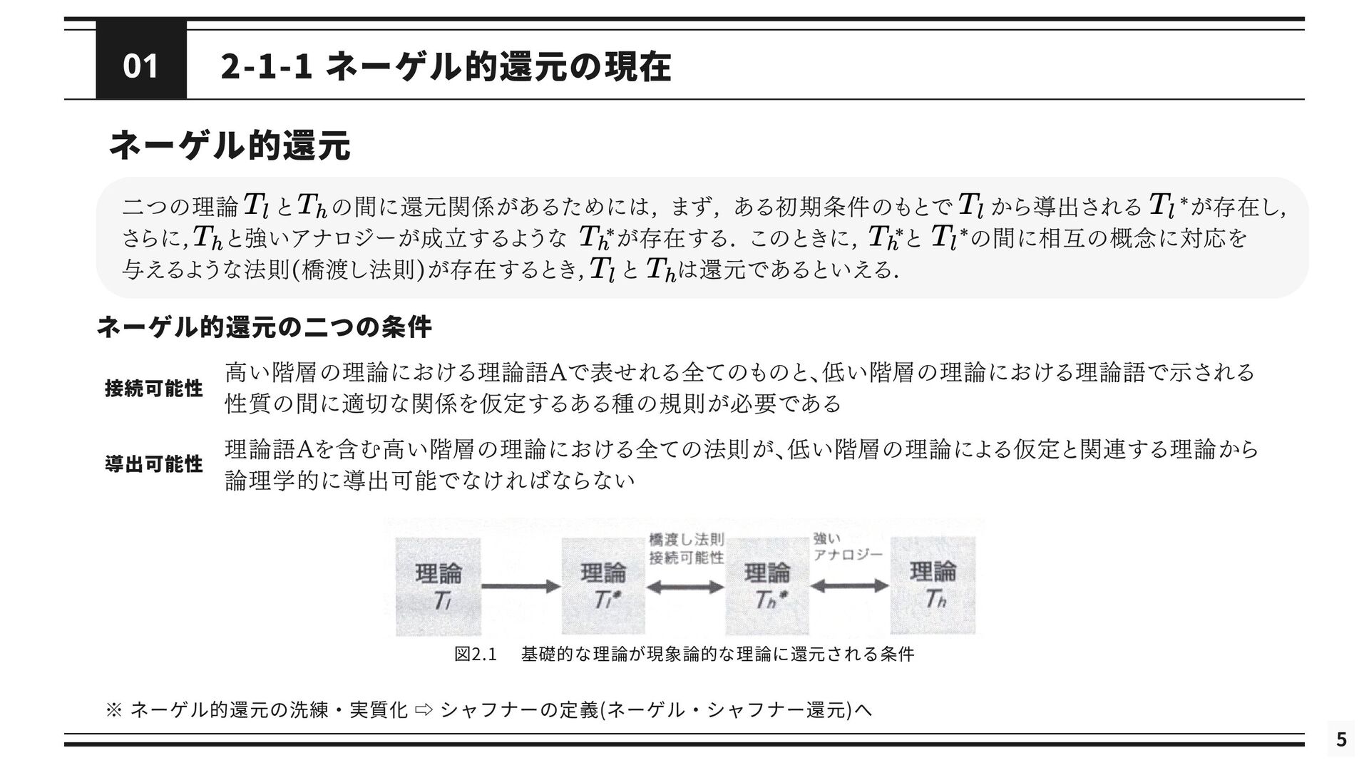 を修正した理論である *と関連付けられる (2) 修正された理論 *というのは, の還元が成立するようにするために修正された理論を指す 導出可能性 (3) が不十分あるいは誤りであると考えられているときに, ないし *が の適用範囲においてより正確な予測 を与えることができる (4) は によって説明される. これが成り立つのは, *と の間に強いアナロジーが成立し, ないし *が がなぜ歴史的に機能してきたのかを説明するとき, または, ないし *によって の適用範囲が説明されたとき である. シャフナーの定義は ・理論間の還元が成立するために, 理論に適宜修正が加えられる点 ・導出可能性を説明という概念に帰着させている点 が特徴的であるが, ネーゲルと同様に理論を命題の集合としてとらえている 再掲 : 図2.1 接続可能性と導出可能性も更新 ⇒ しかし, 実際の物理学では理論を命題の集合として表現しないため, 使いづらいものにとどまっている ⇒ さらに洗練 ⇒ 「一般化されたネーゲル・シャフナー還元」