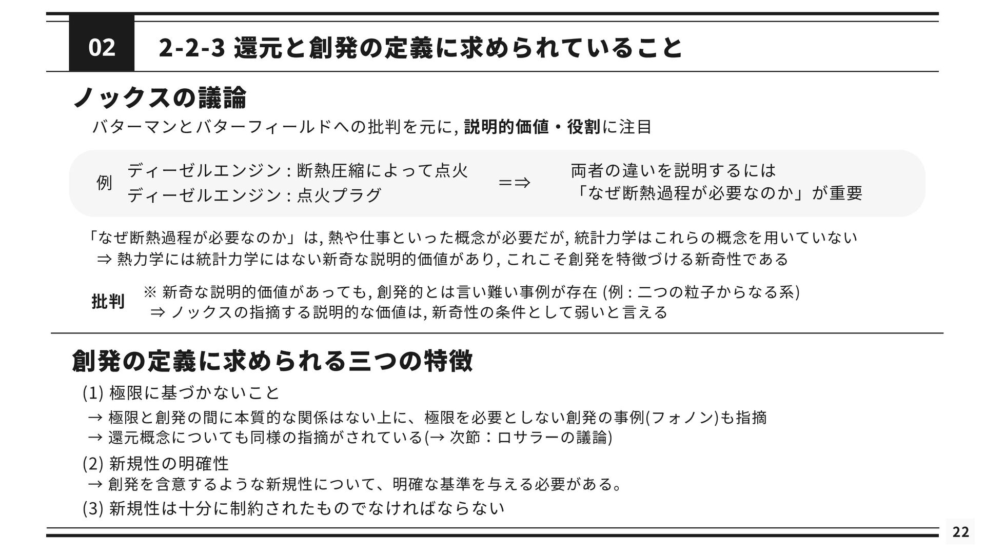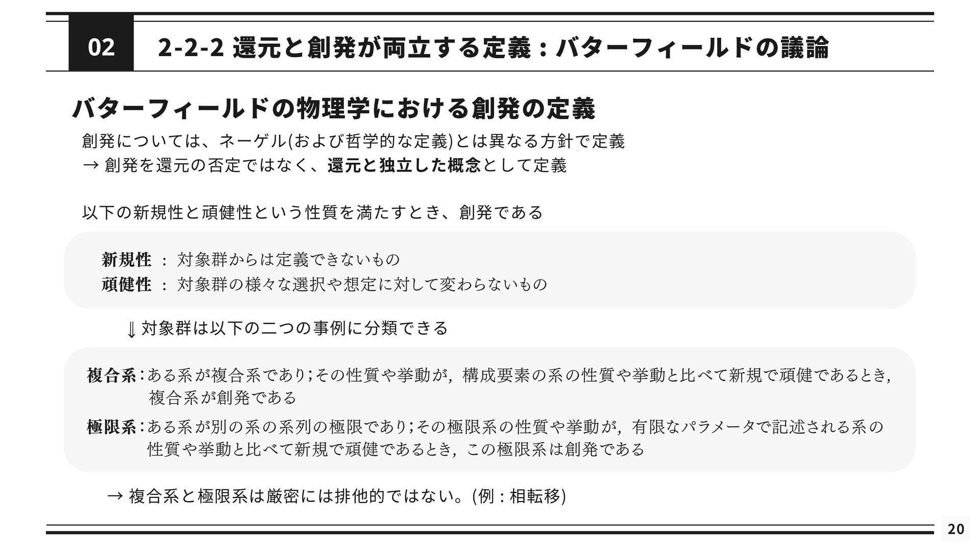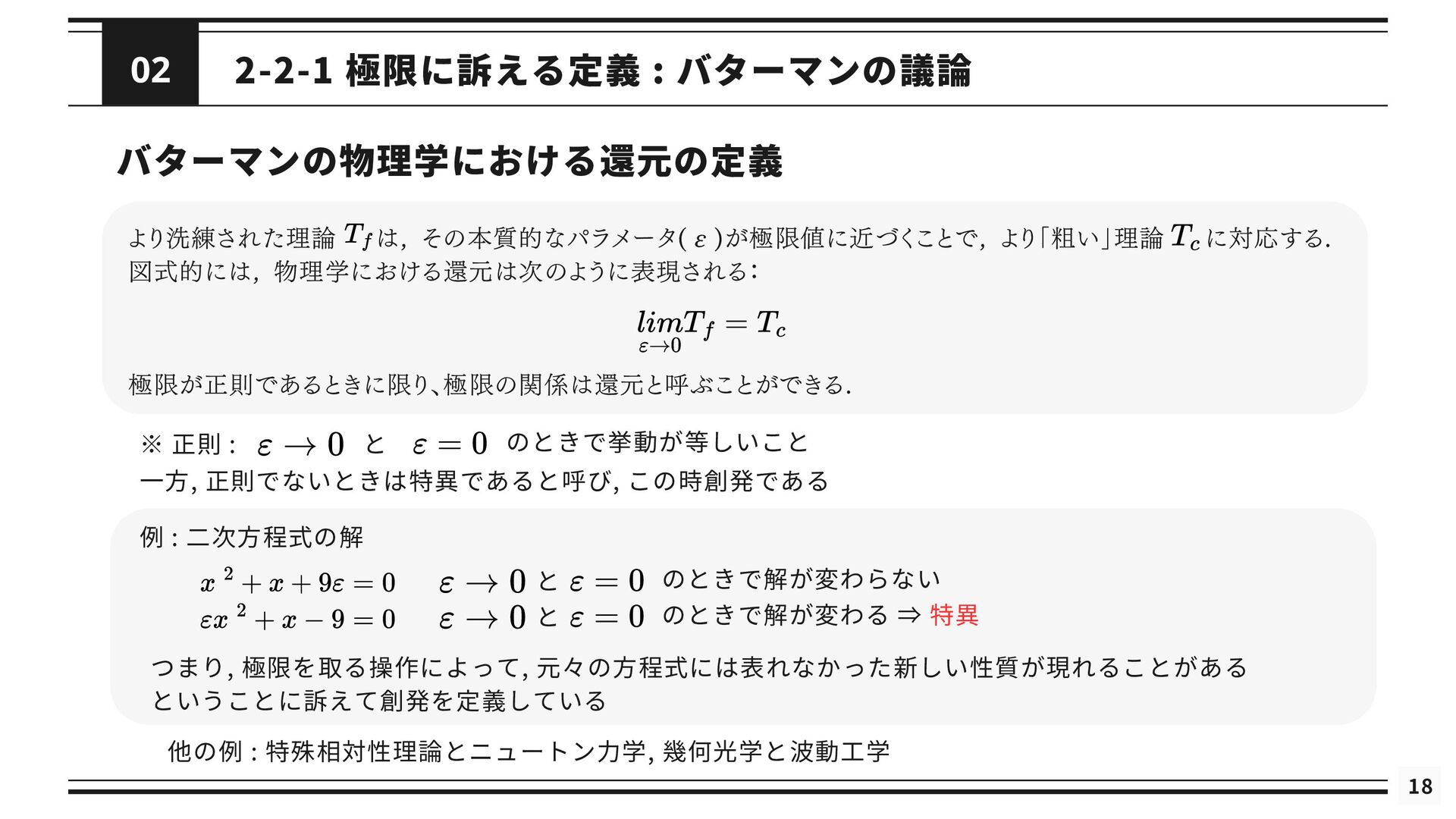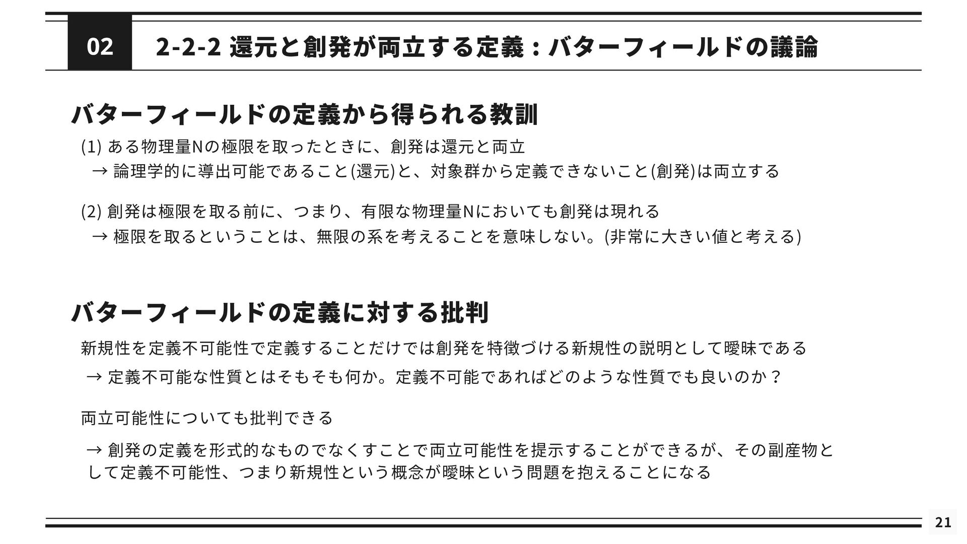 を修正した理論である *と関連付けられる (2) 修正された理論 *というのは, の還元が成立するようにするために修正された理論を指す 導出可能性 (3) が不十分あるいは誤りであると考えられているときに, ないし *が の適用範囲においてより正確な予測 を与えることができる (4) は によって説明される. これが成り立つのは, *と の間に強いアナロジーが成立し, ないし *が がなぜ歴史的に機能してきたのかを説明するとき, または, ないし *によって の適用範囲が説明されたとき である. シャフナーの定義は ・理論間の還元が成立するために, 理論に適宜修正が加えられる点 ・導出可能性を説明という概念に帰着させている点 が特徴的であるが, ネーゲルと同様に理論を命題の集合としてとらえている 再掲 : 図2.1 接続可能性と導出可能性も更新 ⇒ しかし, 実際の物理学では理論を命題の集合として表現しないため, 使いづらいものにとどまっている ⇒ さらに洗練 ⇒ 「一般化されたネーゲル・シャフナー還元」