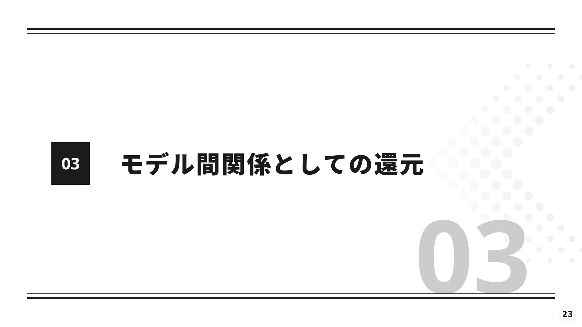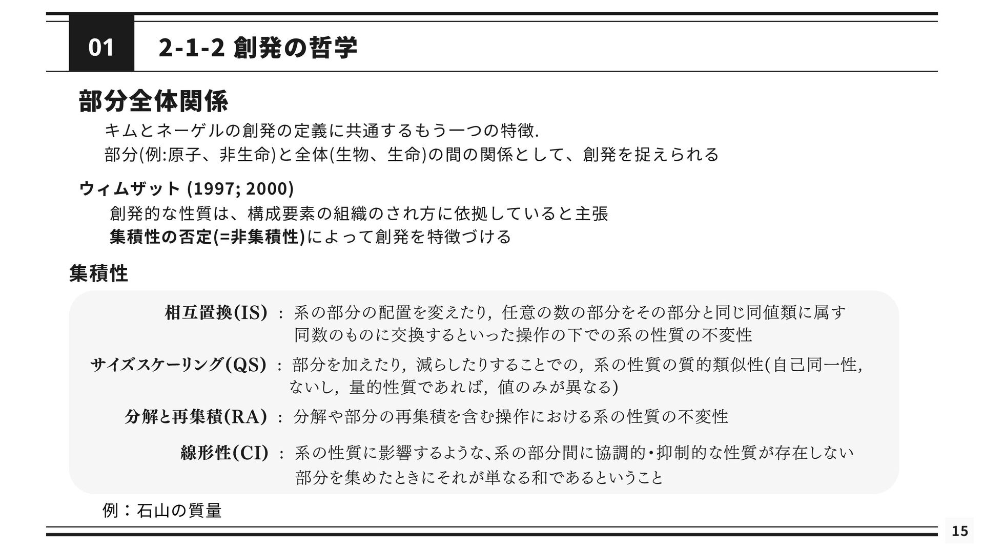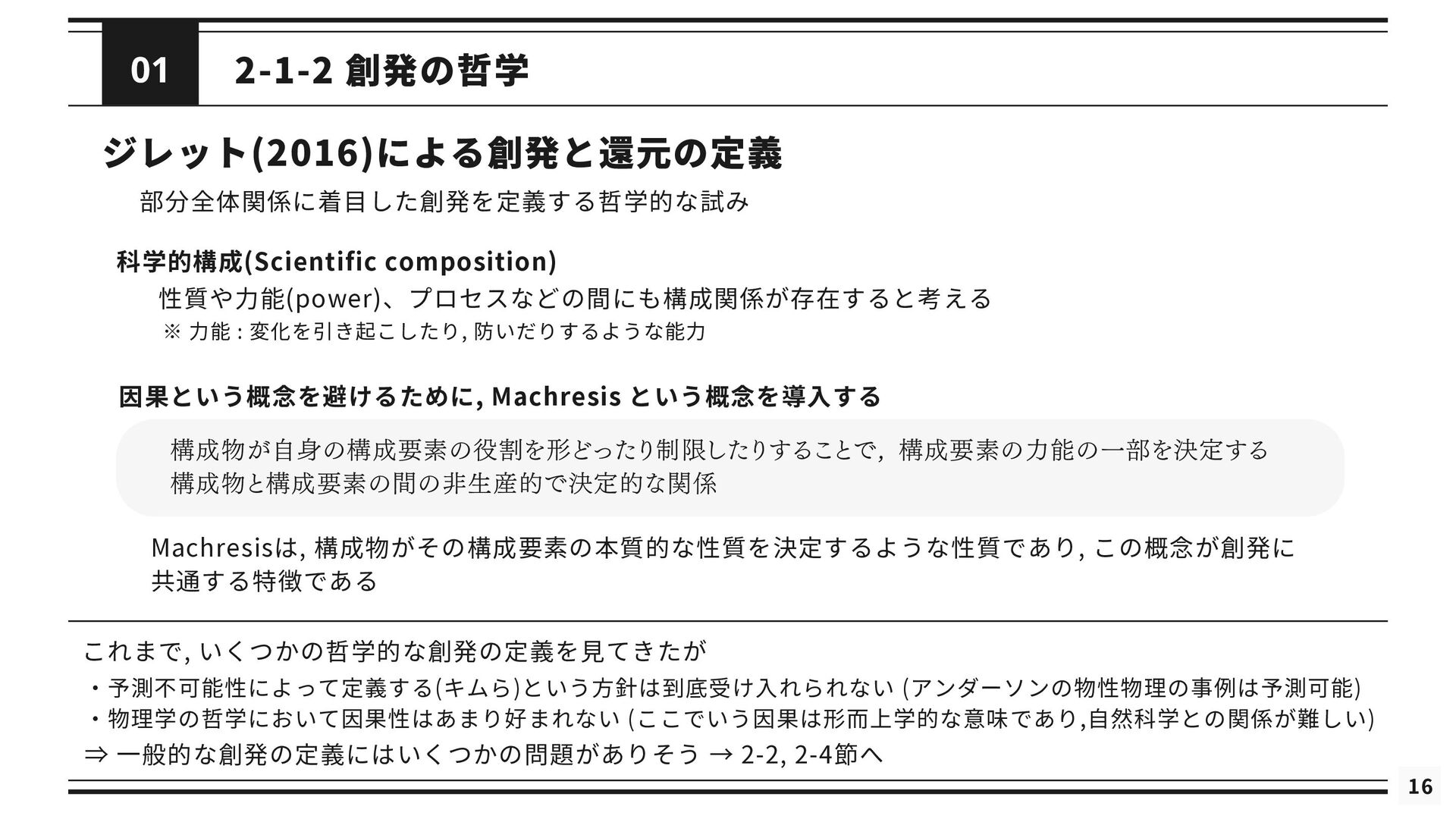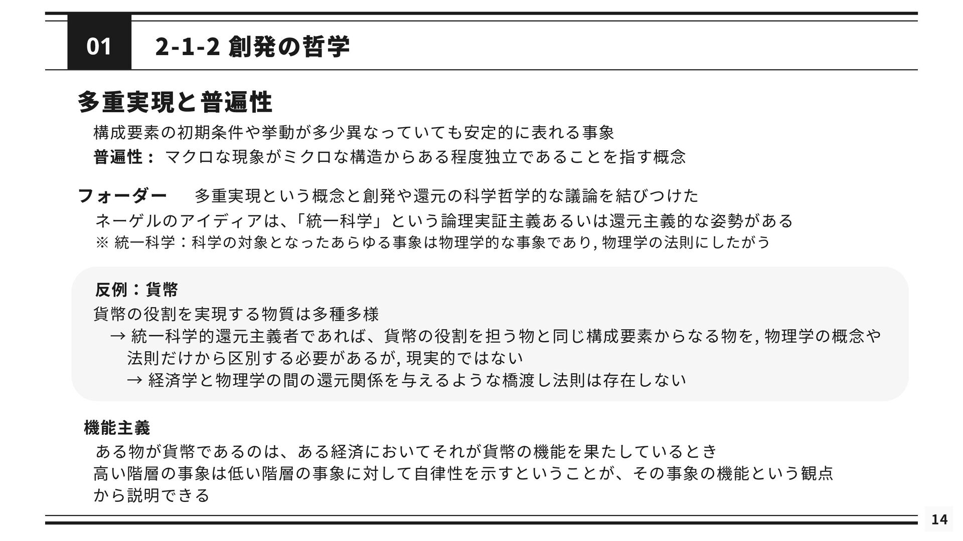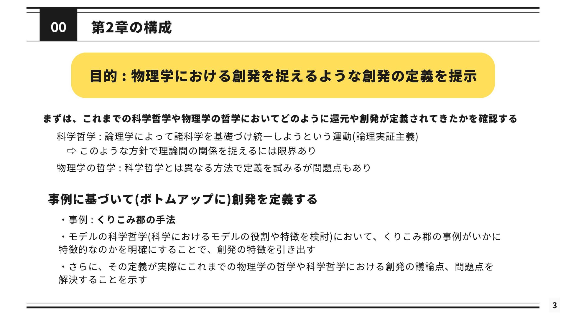 を修正した理論である *と関連付けられる (2) 修正された理論 *というのは, の還元が成立するようにするために修正された理論を指す 導出可能性 (3) が不十分あるいは誤りであると考えられているときに, ないし *が の適用範囲においてより正確な予測 を与えることができる (4) は によって説明される. これが成り立つのは, *と の間に強いアナロジーが成立し, ないし *が がなぜ歴史的に機能してきたのかを説明するとき, または, ないし *によって の適用範囲が説明されたとき である. シャフナーの定義は ・理論間の還元が成立するために, 理論に適宜修正が加えられる点 ・導出可能性を説明という概念に帰着させている点 が特徴的であるが, ネーゲルと同様に理論を命題の集合としてとらえている 再掲 : 図2.1 接続可能性と導出可能性も更新 ⇒ しかし, 実際の物理学では理論を命題の集合として表現しないため, 使いづらいものにとどまっている ⇒ さらに洗練 ⇒ 「一般化されたネーゲル・シャフナー還元」