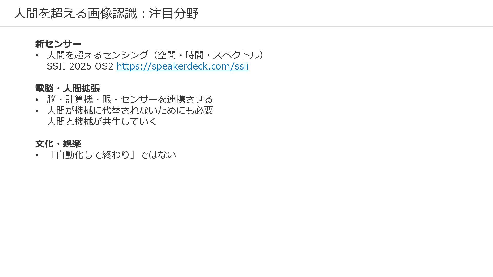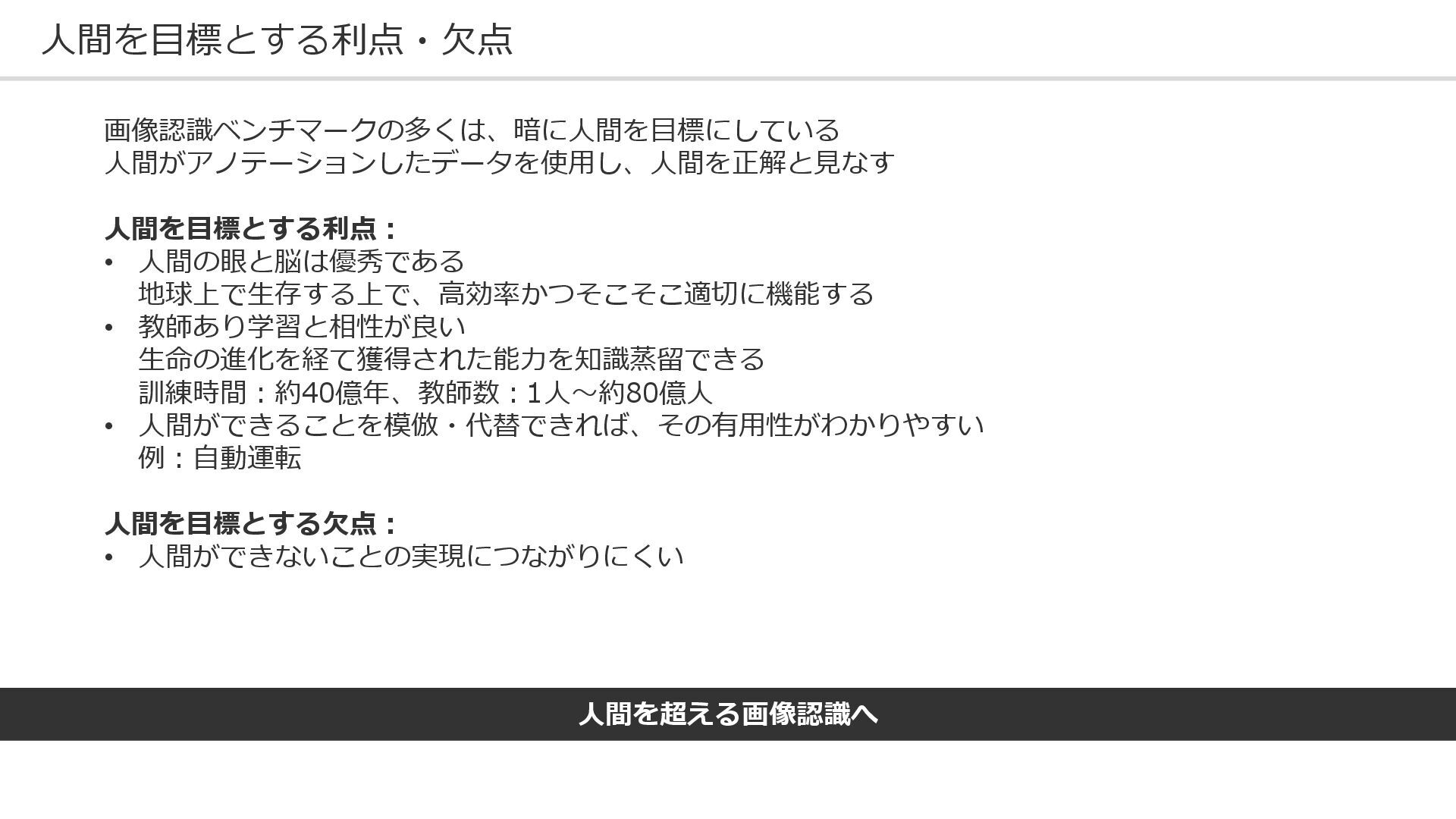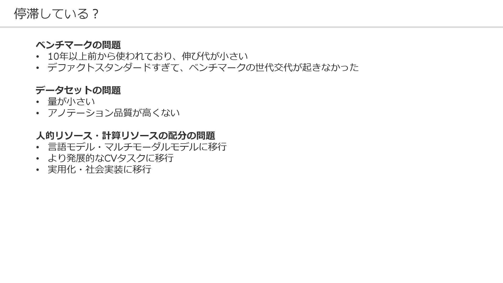 概要:ImageNetやCOCOなどのベンチマークは、精度競争を促すことで画像認識技術の発展を推進してきました。また、DNNの実用化が進むにつれ、推論速度・訓練エポック数などの推論効率・訓練効率を考慮した競争が行われてきました。本講演では、特に物体検出における技術開発競争の歴史を振り返るとともに、今後重要になる人間を超える画像認識について議論します。