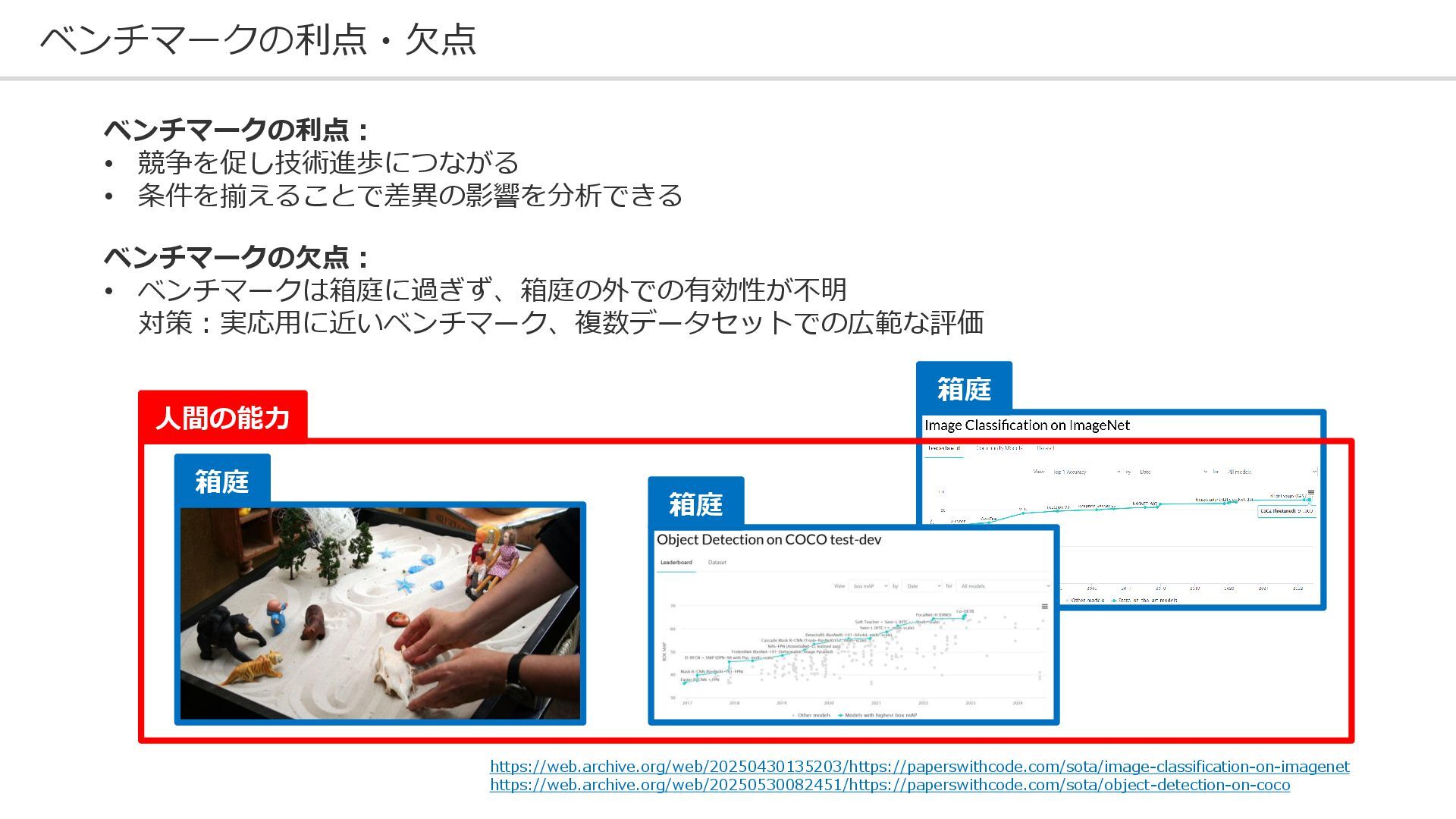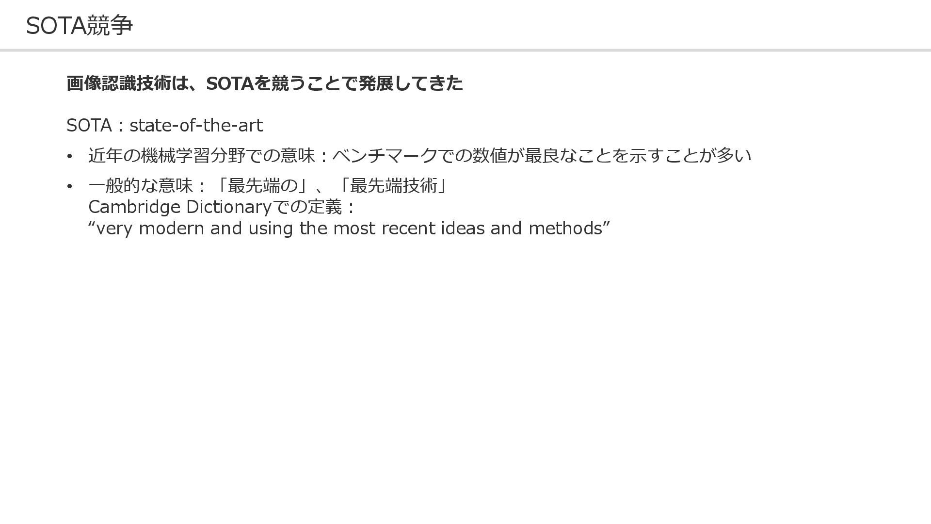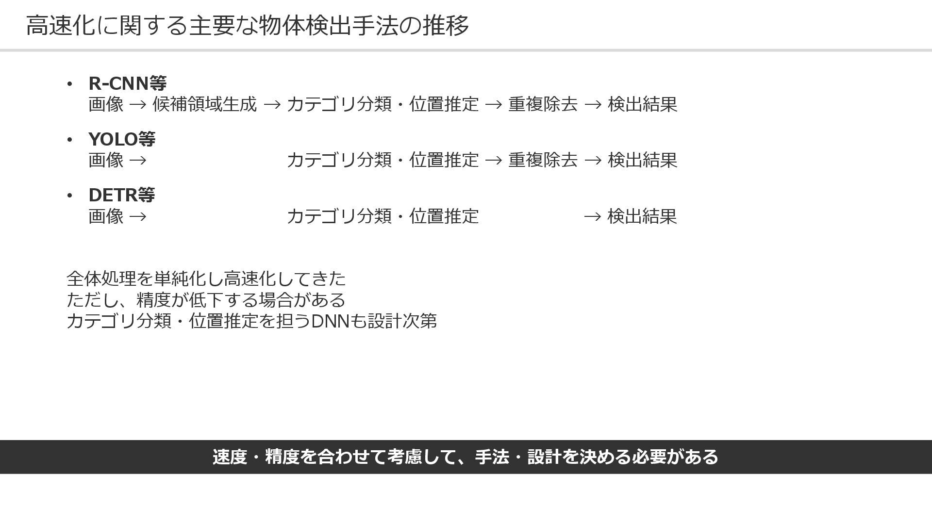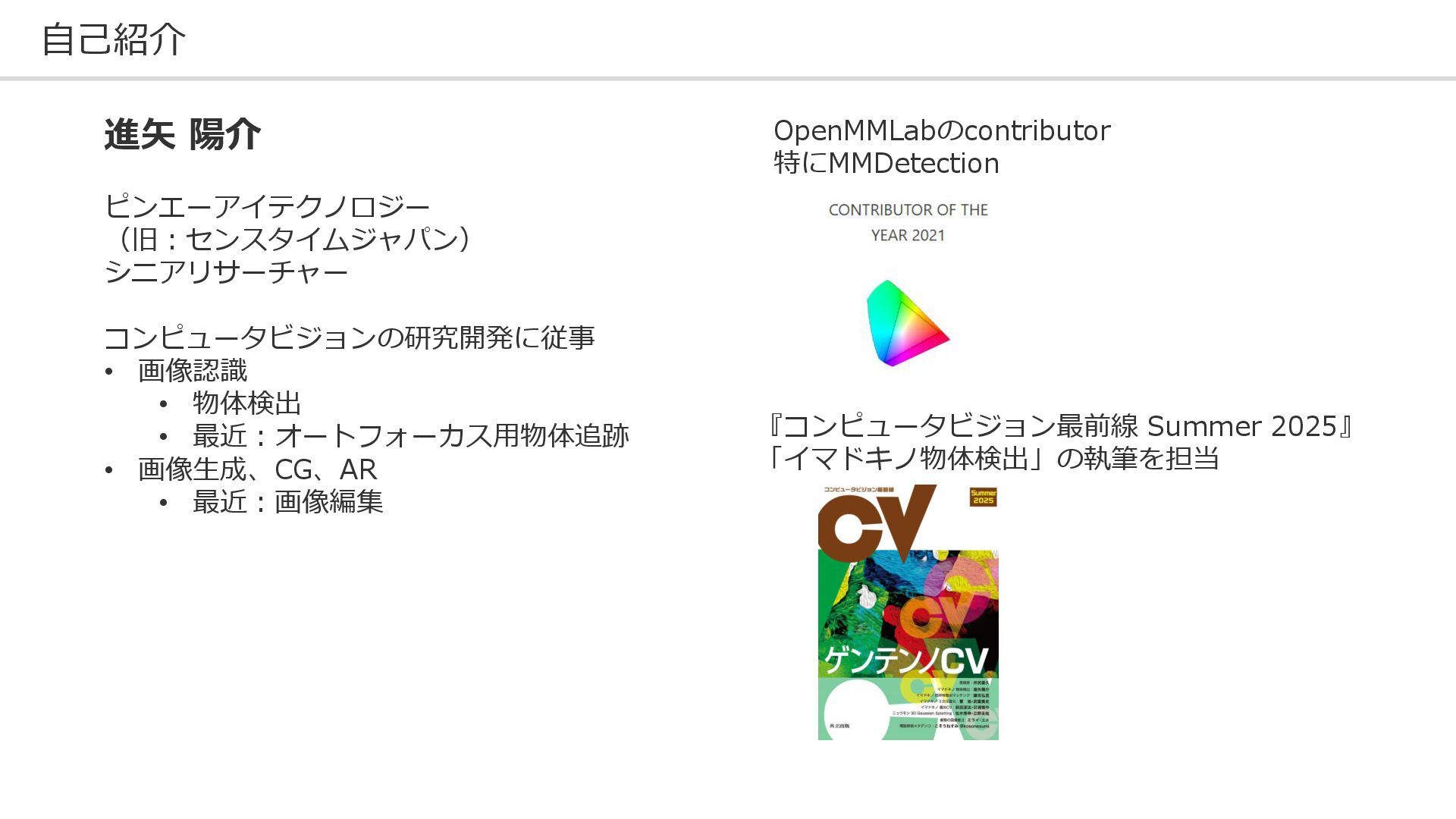 概要:ImageNetやCOCOなどのベンチマークは、精度競争を促すことで画像認識技術の発展を推進してきました。また、DNNの実用化が進むにつれ、推論速度・訓練エポック数などの推論効率・訓練効率を考慮した競争が行われてきました。本講演では、特に物体検出における技術開発競争の歴史を振り返るとともに、今後重要になる人間を超える画像認識について議論します。