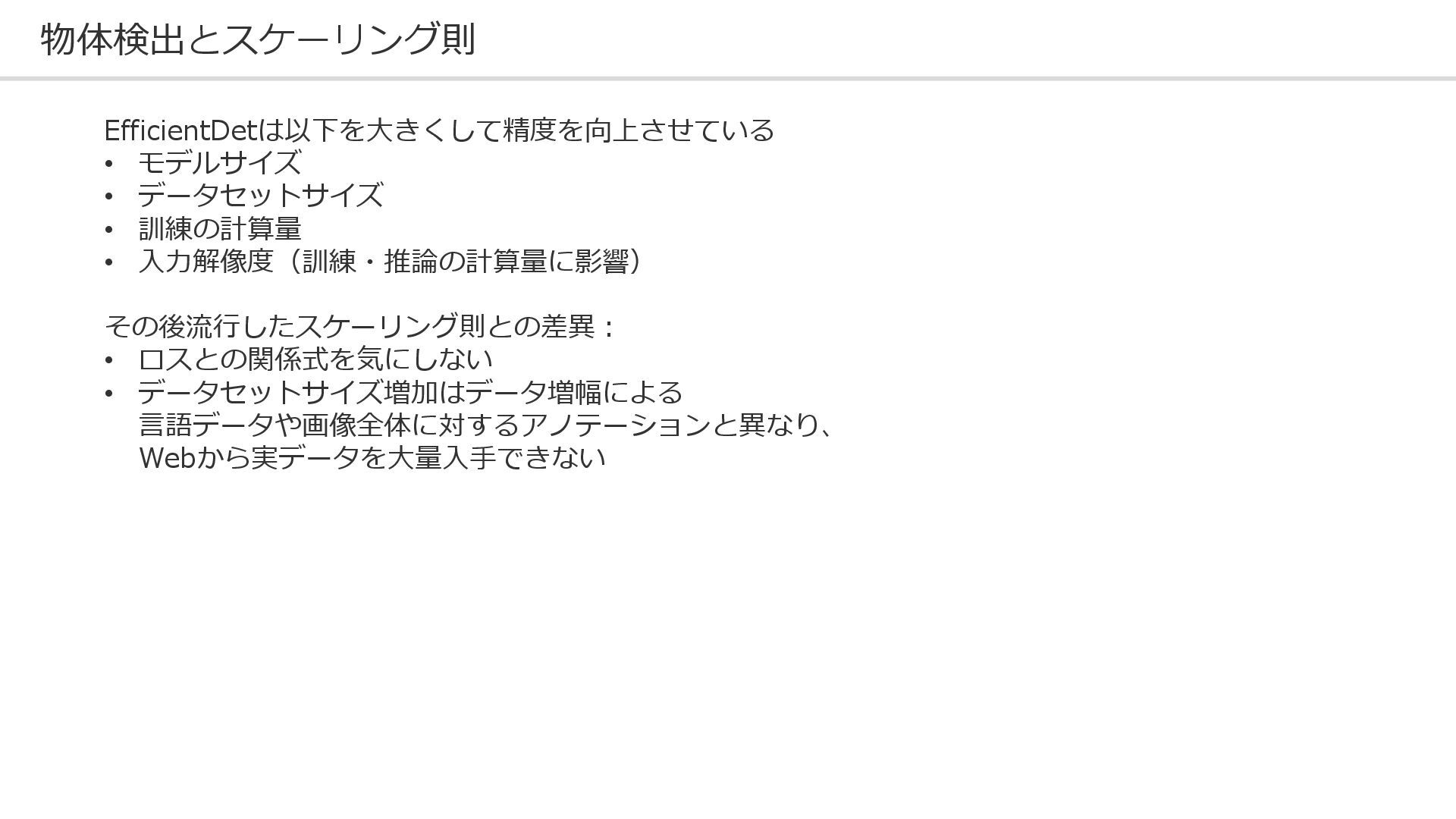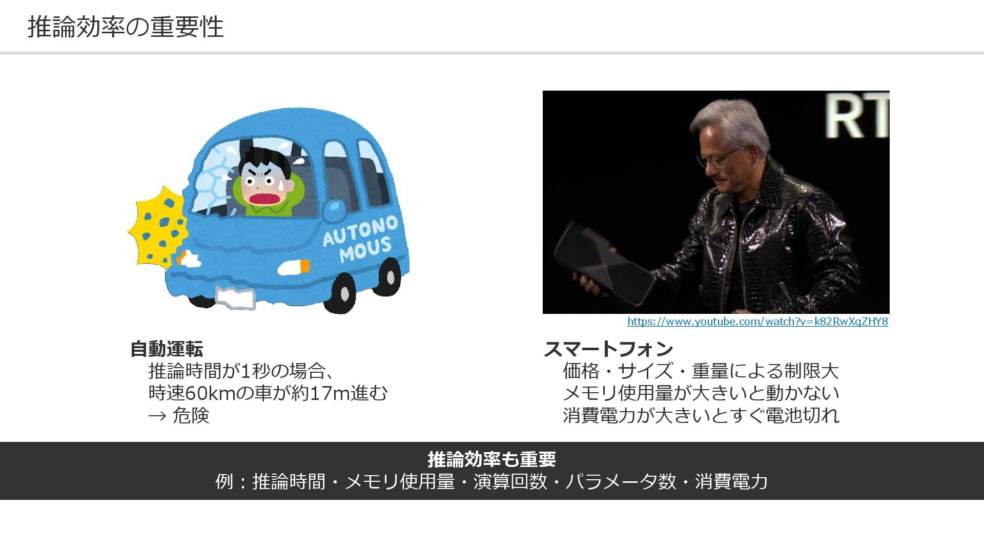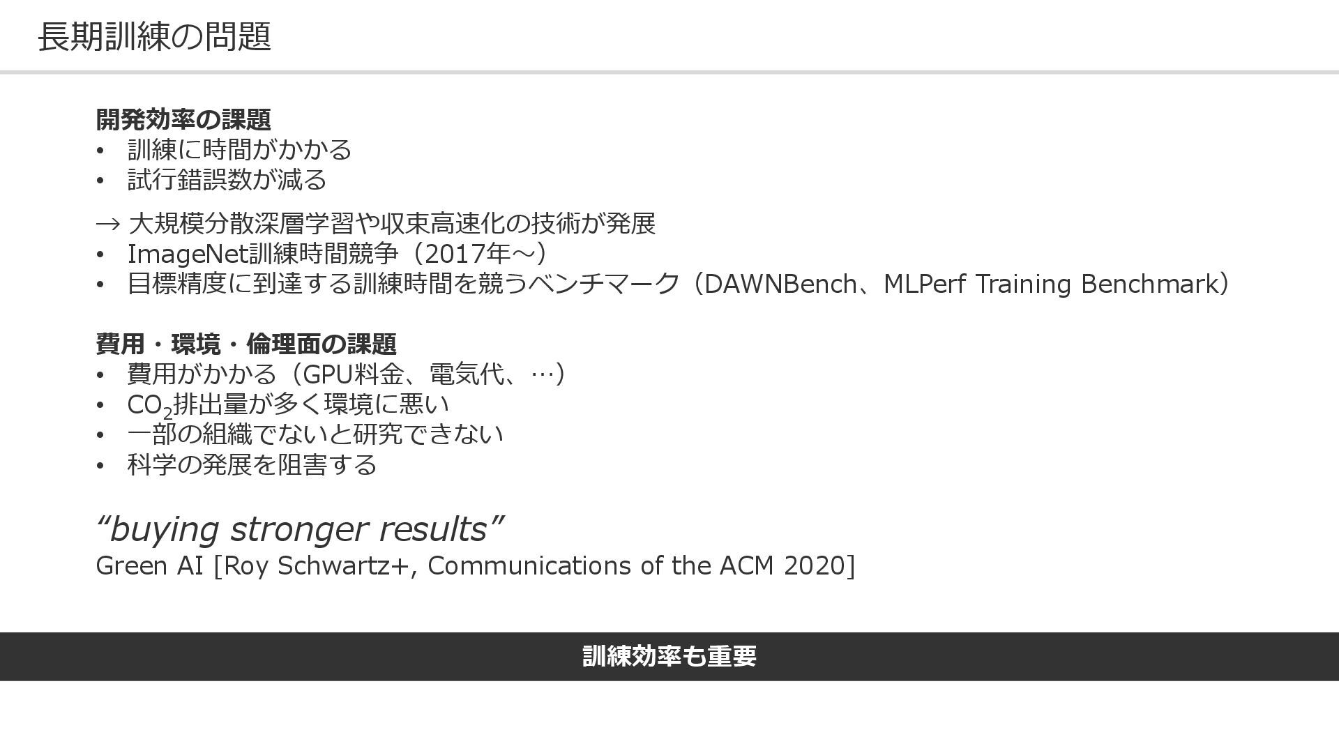 • 目標精度に到達する訓練時間を競うベンチマーク(DAWNBench、MLPerf Training Benchmark) 費用・環境・倫理面の課題 • 費用がかかる(GPU料金、電気代、…) • CO 2 排出量が多く環境に悪い • 一部の組織でないと研究できない • 科学の発展を阻害する “buying stronger results” Green AI [Roy Schwartz+, Communications of the ACM 2020] 訓練効率も重要