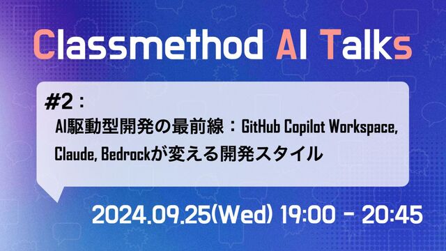 ・CATs #2 :AI駆動型開発の最前線:GitHub Copilot Workspace、Claude、Bedrockが変える開発スタイル - Classmethod AI Talks(CATs) | Doorkeeper https://cats.doorkeeper.jp/events/177177