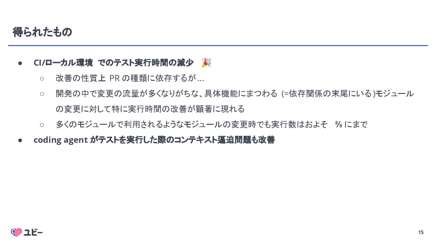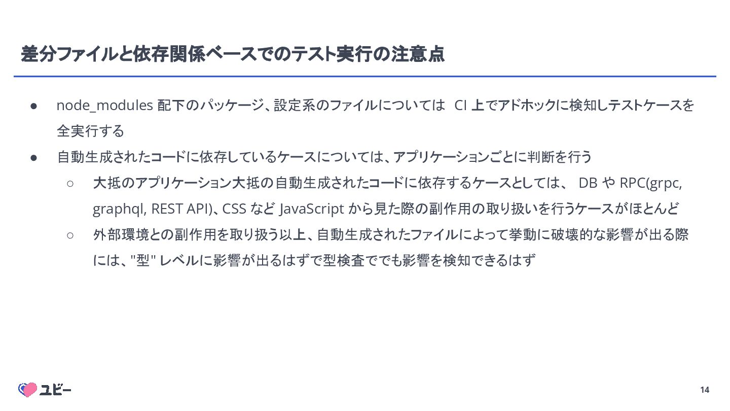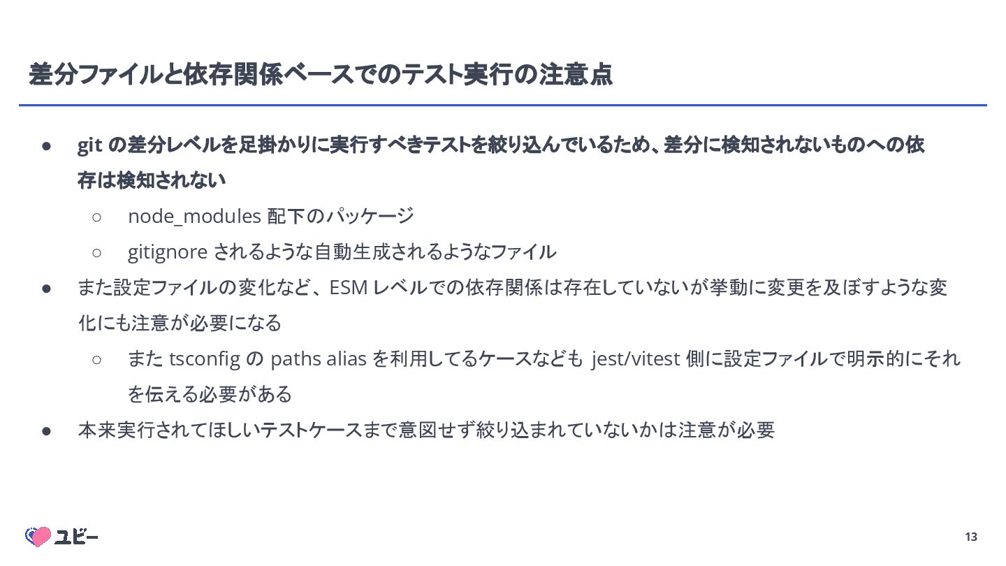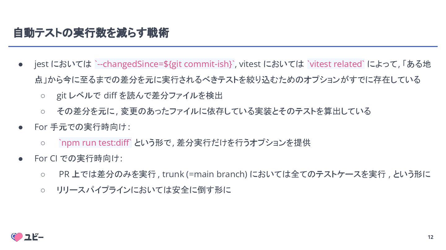related` によって, 「ある地 点」から今に至るまでの差分を元に実行されるべきテストを絞り込むためのオプションがすでに存在している ◦ git レベルで diff を読んで差分ファイルを検出 ◦ その差分を元に, 変更のあったファイルに依存している実装とそのテストを算出している • For 手元での実行時向け : ◦ `npm run test:diff` という形で, 差分実行だけを行うオプションを提供 • For CI での実行時向け: ◦ PR 上では差分のみを実行 , trunk (=main branch) においては全てのテストケースを実行 , という形に ◦ リリースパイプラインにおいては安全に倒す形に