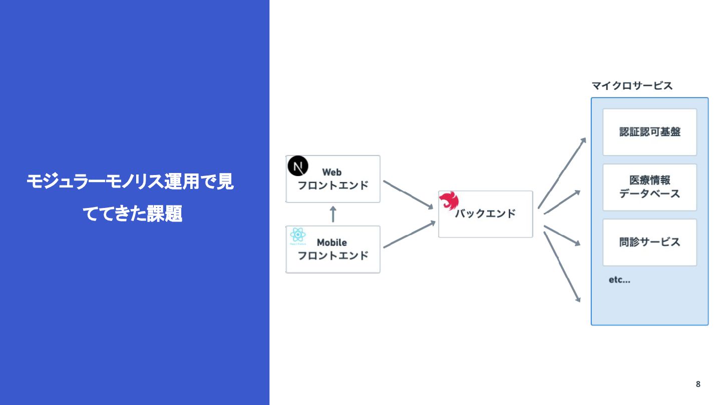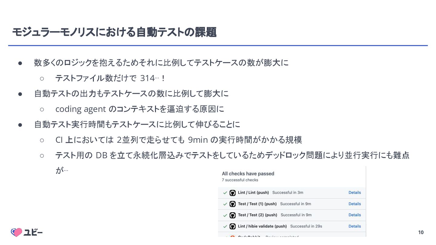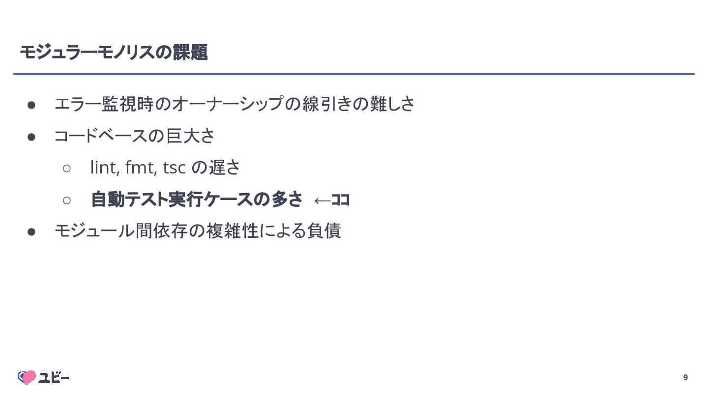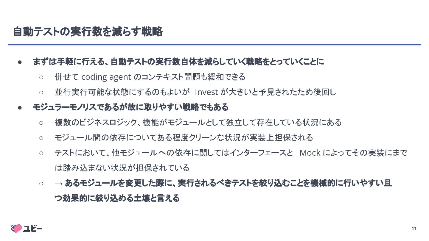 related` によって, 「ある地 点」から今に至るまでの差分を元に実行されるべきテストを絞り込むためのオプションがすでに存在している ◦ git レベルで diff を読んで差分ファイルを検出 ◦ その差分を元に, 変更のあったファイルに依存している実装とそのテストを算出している • For 手元での実行時向け : ◦ `npm run test:diff` という形で, 差分実行だけを行うオプションを提供 • For CI での実行時向け: ◦ PR 上では差分のみを実行 , trunk (=main branch) においては全てのテストケースを実行 , という形に ◦ リリースパイプラインにおいては安全に倒す形に