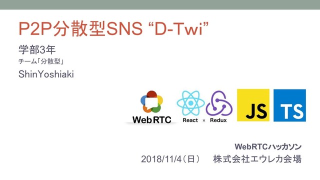 学部3年 チーム「分散型」 ShinYoshiaki WebRTCハッカソン 2018/11/4(日) 株式会社エウレカ会場 P2P分散型SNS “D-Twi”