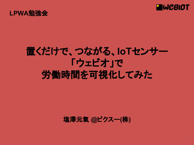 1 置くだけで、つながる、IoTセンサー 「ウェビオ」で 労働時間を可視化してみた 塩澤元氣 @ピクスー(株) LPWA勉強会