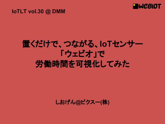1 置くだけで、つながる、IoTセンサー 「ウェビオ」で 労働時間を可視化してみた しおげん@ピクスー(株) IoTLT vol.30 @ DMM
