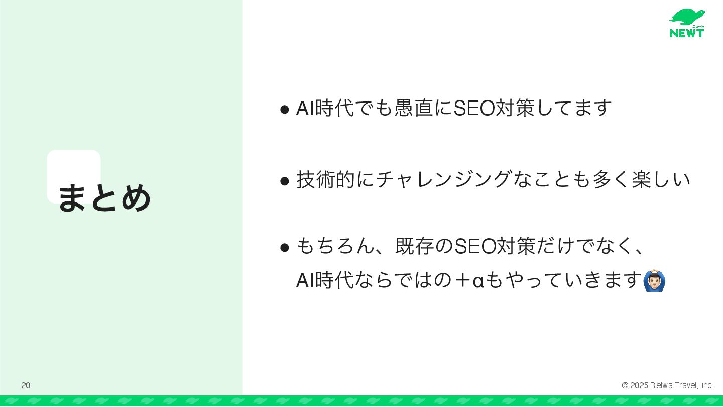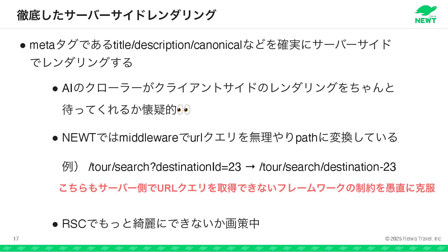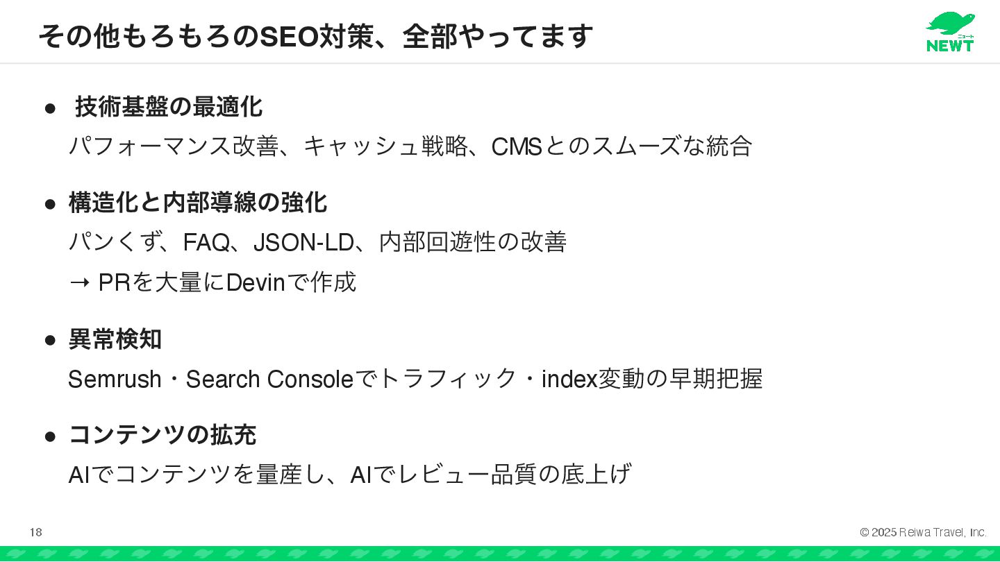 令和トラベルの具体的な取り組みとして「精緻なURL設計」と「徹底したサーバーサイドレンダリング」をご紹介します。AI時代においてもSEOの本質は変わっておらず、むしろ技術的に挑戦しがいのある領域になっています。