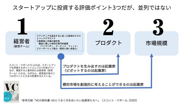 経営者 (経営チーム) スタートアップに投資する評価ポイント3つだが、並列ではない プロダクト 市場規模 標的市場を創造的に考えることができるのは起業家 プロダクトを⽣み出すのは起業家 (ピボットするのは起業家) *ࢀߟจݙʮVCͷڭՊॻ: VCͱ͏·͖͘߹͍͍ͨىۀՈͨͪʯʢείοτɾΫϙʔϧ