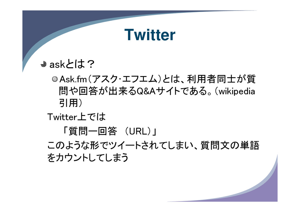 Twitter askとは? Ask.fm(アスク・エフエム)とは、利用者同士が質 問や回答が出来るQ&Aサイトである。(wikipedia 引用) Twitter上では 「質問ー回答 (URL)」 このような形でツイートされてしまい、質問文の単語 をカウントしてしまう