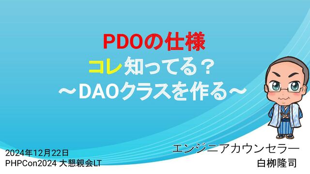 2024年12月22日 PHPConference2024 大懇親会LT で発表した資料です。 自作の家計簿アプリの為に作ったDAOクラスに問題を見つけました。 それを解決しようと公式のドキュメントを確認していたら、思いもよらなかった仕様を発見しました。 果たして、このDAOクラスの実装は適切なのでしょうか?
