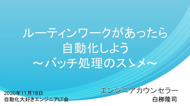 2020年11月18日 自動化大好きエンジニアLT会 で登壇したときの資料です。 https://rakus.connpass.com/event/192101/