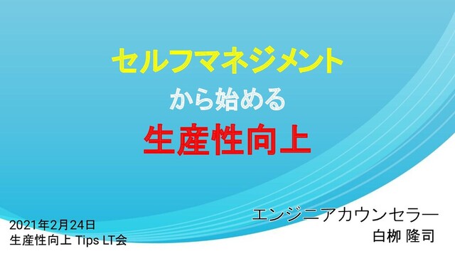 生産性向上の為には、自分自身をマネジメントすることが大事です。 マネジメントに対しての拒絶感を解いて、セルフマネジメントに目を向ける助けに、このスライドがなればいいな、と願っています。