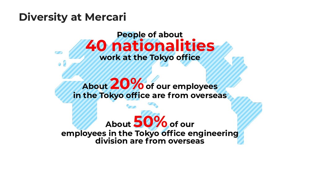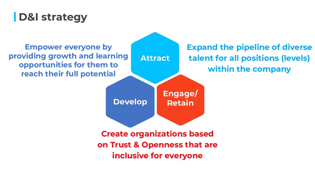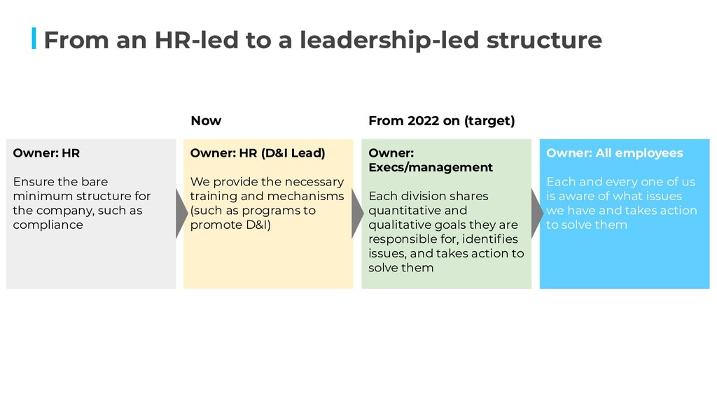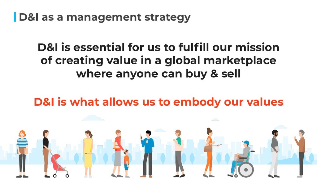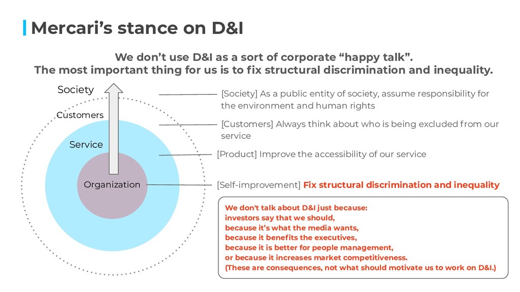 Customers Service Organization Society [Product] Improve the accessibility of our service [Customers] Always think about who is being excluded from our service [Society] As a public entity of society, assume responsibility for the environment and human rights We don't talk about D&I just because: investors say that we should, because it’s what the media wants, because it benefits the executives, because it is better for people management, or because it increases market competitiveness. (These are consequences, not what should motivate us to work on D&I.) We don’t use D&I as a sort of corporate “happy talk”. The most important thing for us is to fix structural discrimination and inequality.