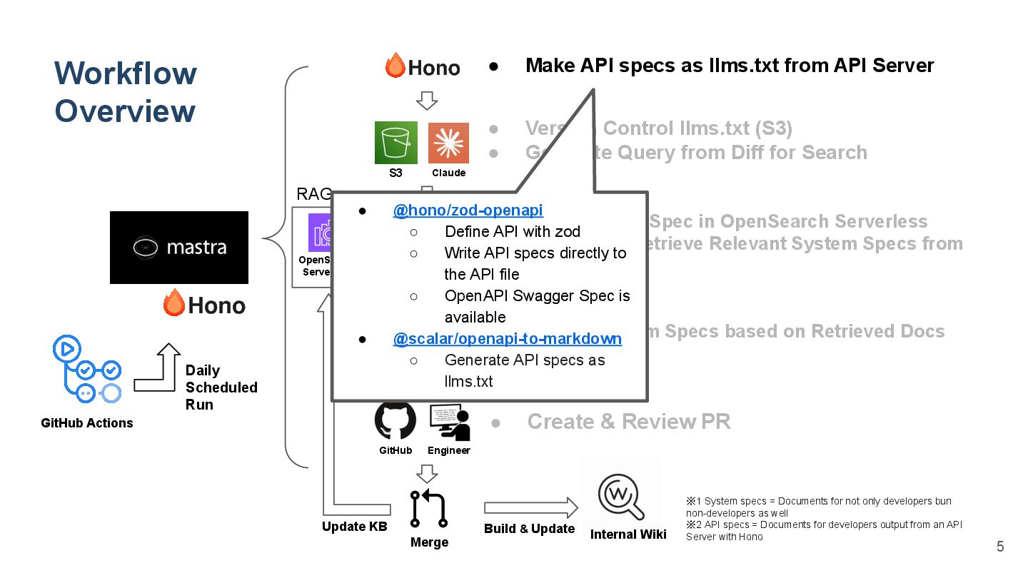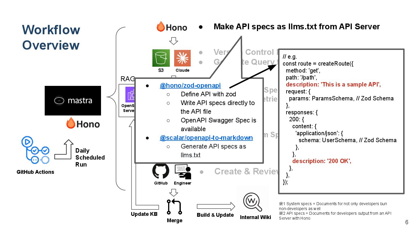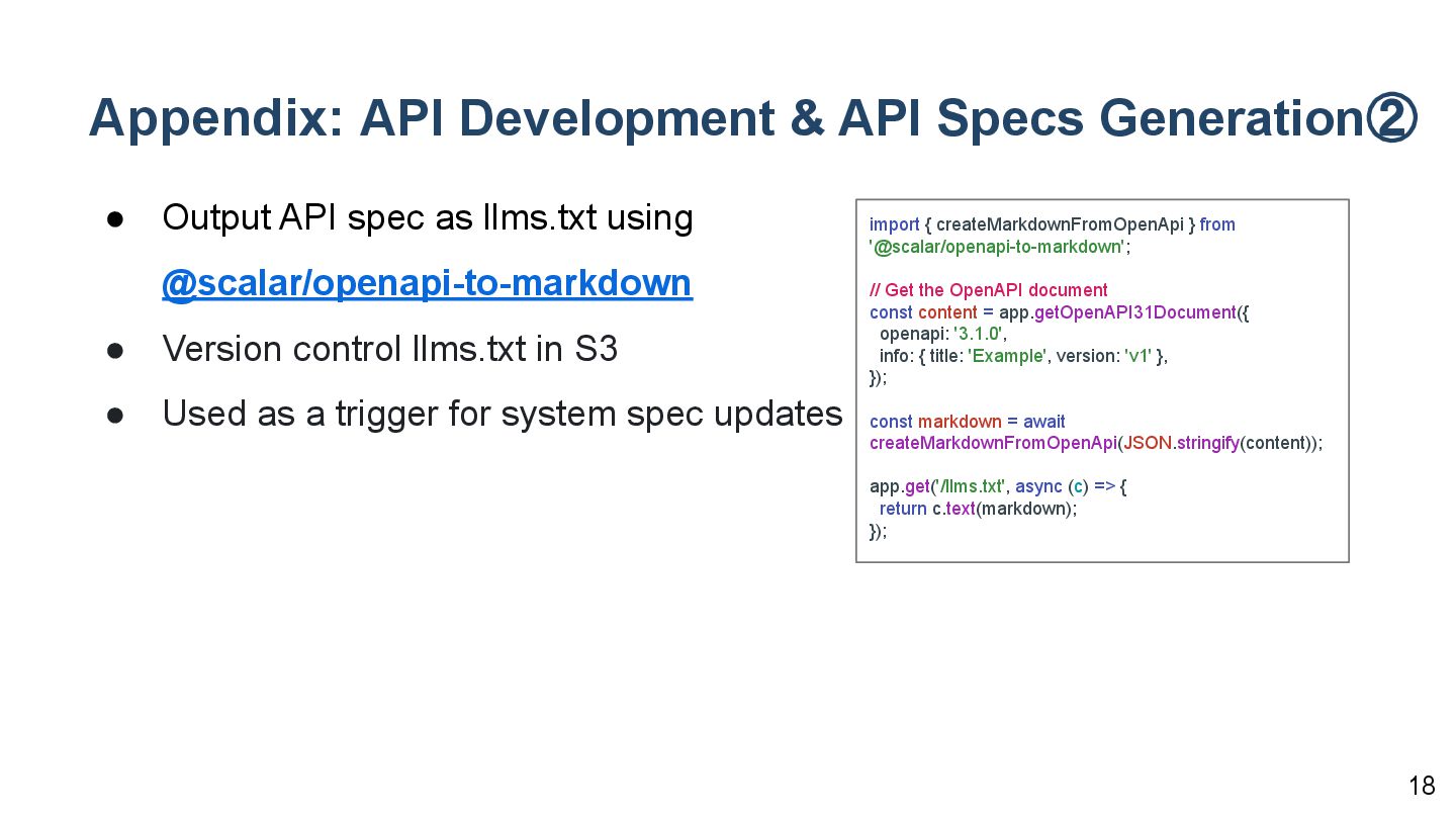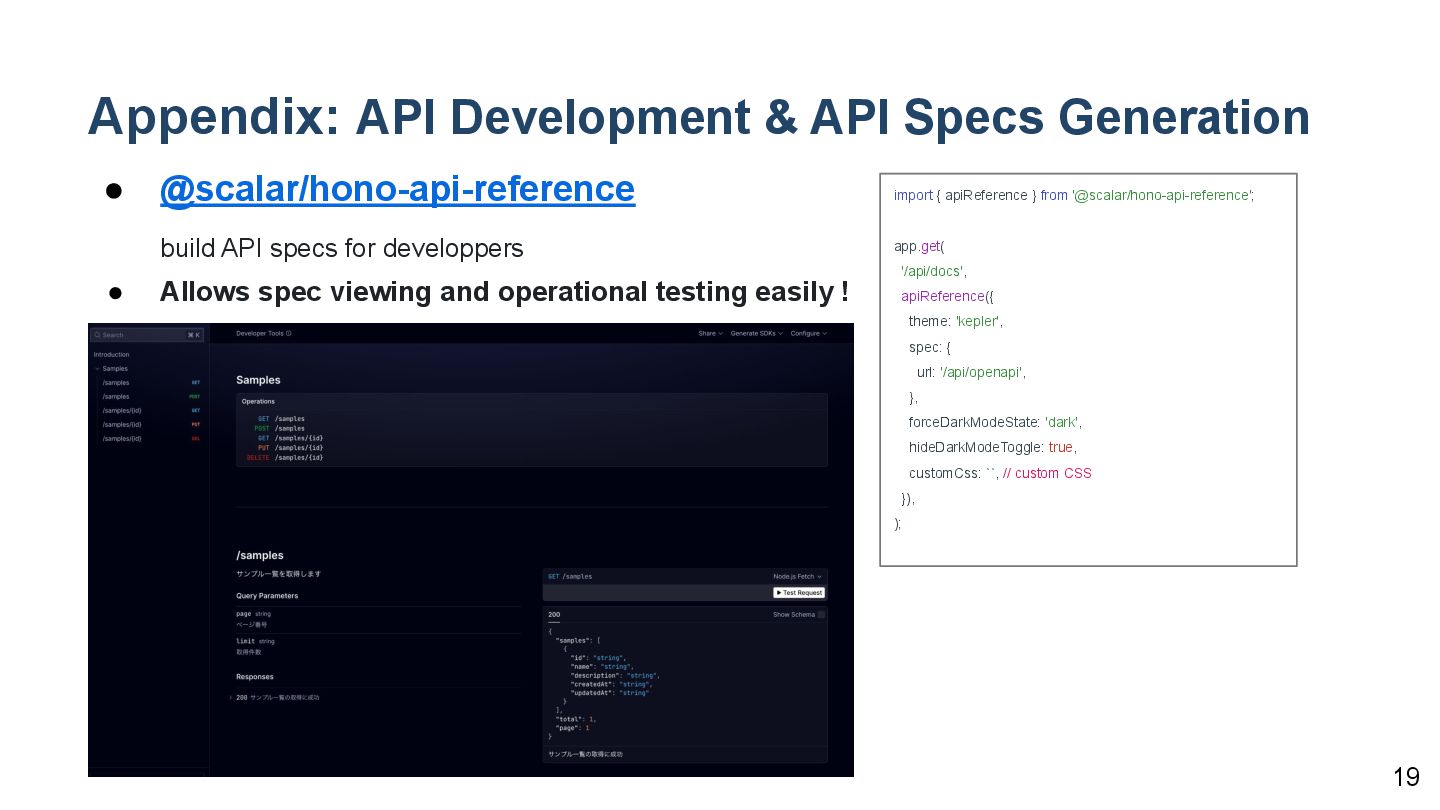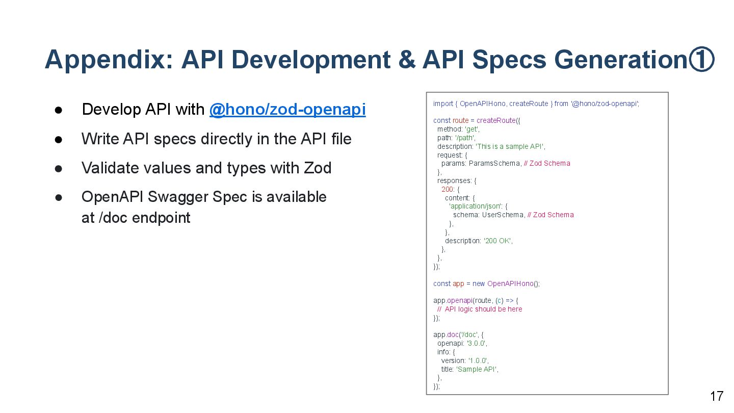 in the API file • Validate values and types with Zod • OpenAPI Swagger Spec is available at /doc endpoint import { OpenAPIHono, createRoute } from '@hono/zod-openapi'; const route = createRoute({ method: 'get', path: '/path', description: 'This is a sample API', request: { params: ParamsSchema, // Zod Schema }, responses: { 200: { content: { 'application/json': { schema: UserSchema, // Zod Schema }, }, description: '200 OK', }, }, }); const app = new OpenAPIHono(); app.openapi(route, (c) => { // API logic should be here }); app.doc('/doc', { openapi: '3.0.0', info: { version: '1.0.0', title: 'Sample API', }, }); Appendix: API Development & API Specs Generation① 17