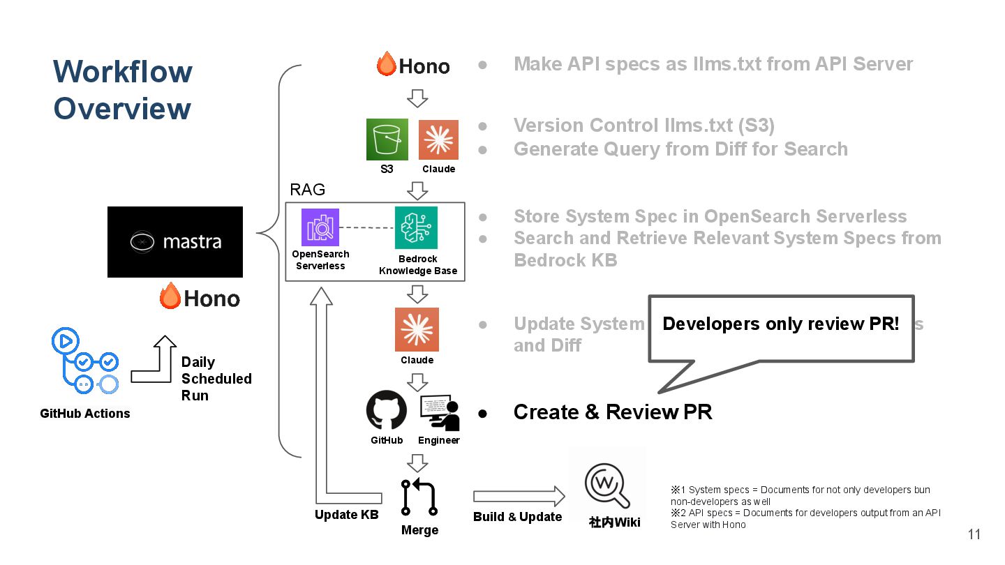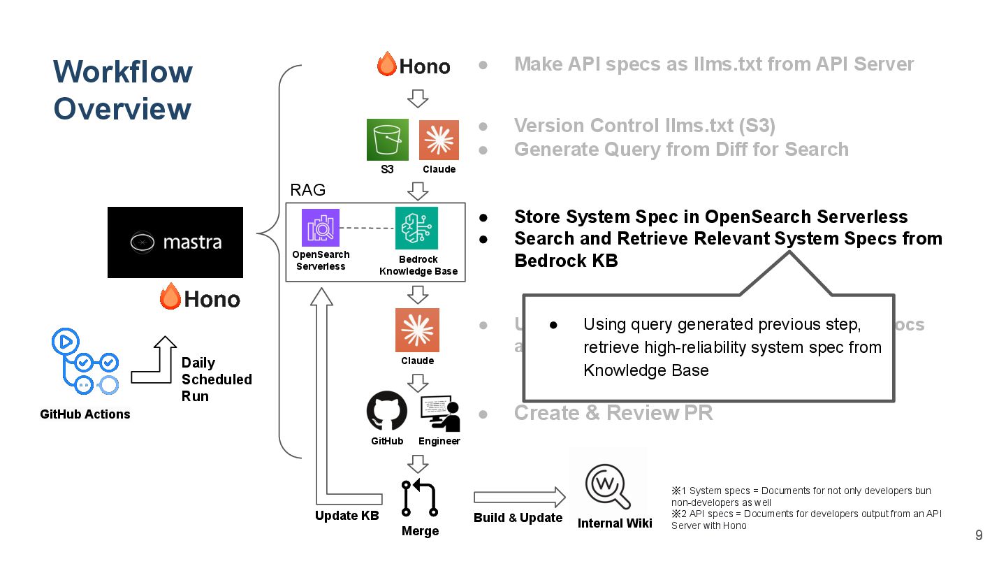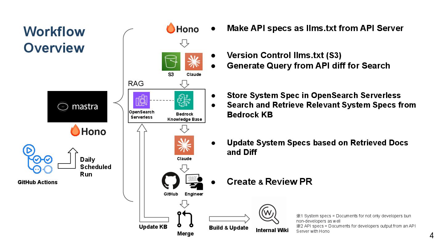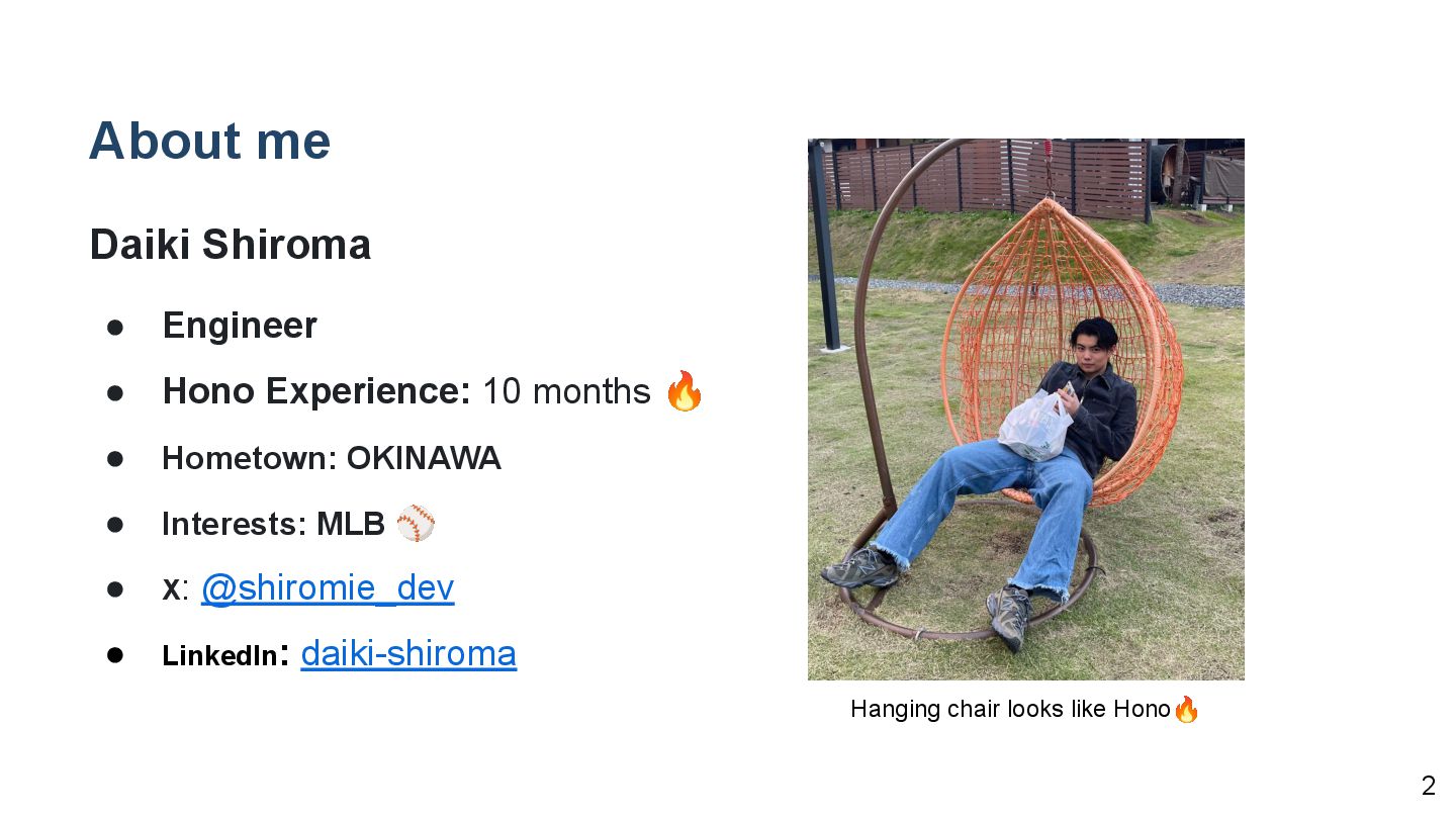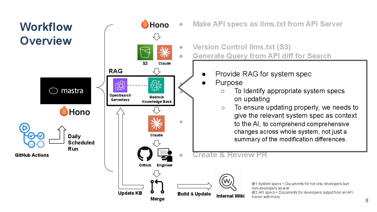in the API file • Validate values and types with Zod • OpenAPI Swagger Spec is available at /doc endpoint import { OpenAPIHono, createRoute } from '@hono/zod-openapi'; const route = createRoute({ method: 'get', path: '/path', description: 'This is a sample API', request: { params: ParamsSchema, // Zod Schema }, responses: { 200: { content: { 'application/json': { schema: UserSchema, // Zod Schema }, }, description: '200 OK', }, }, }); const app = new OpenAPIHono(); app.openapi(route, (c) => { // API logic should be here }); app.doc('/doc', { openapi: '3.0.0', info: { version: '1.0.0', title: 'Sample API', }, }); Appendix: API Development & API Specs Generation① 17
