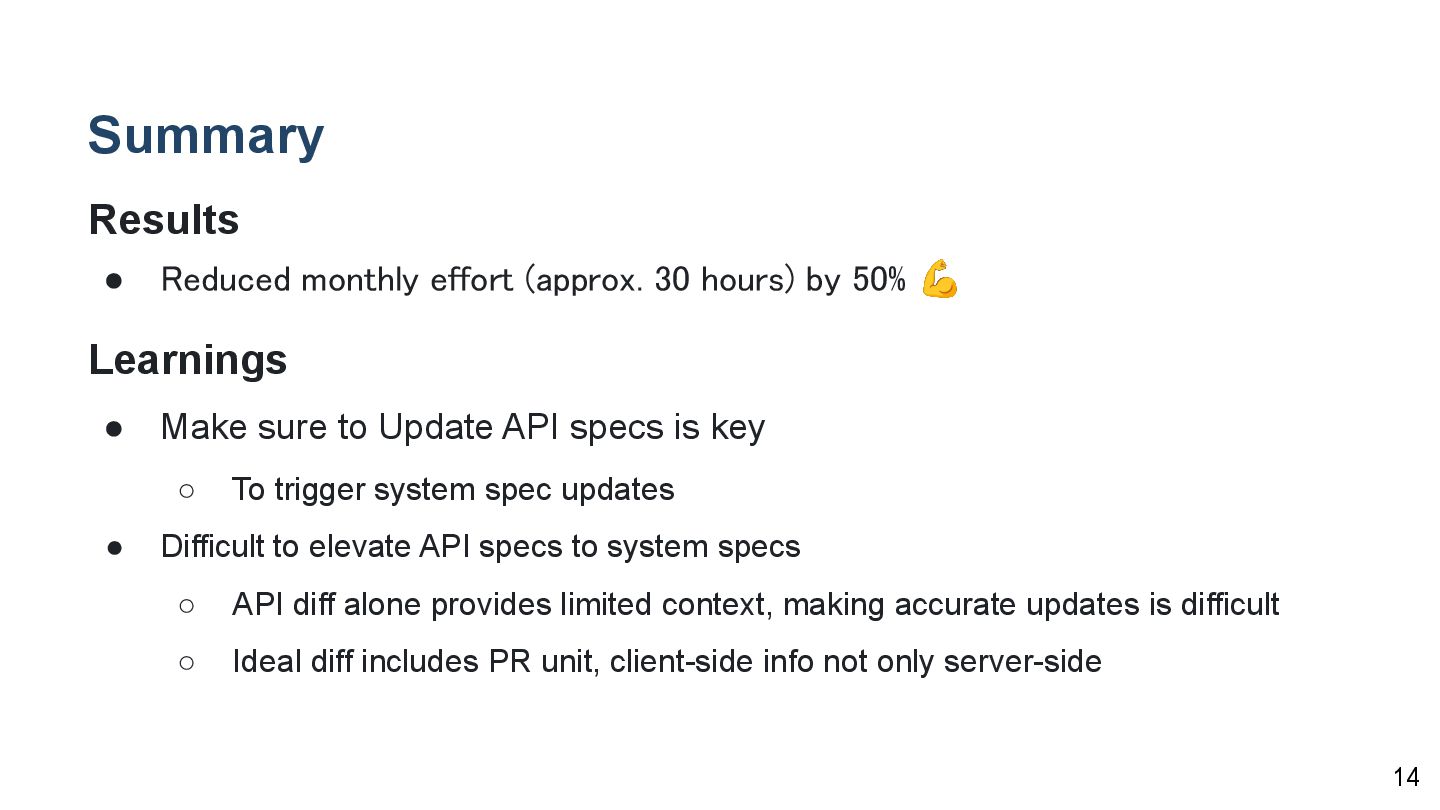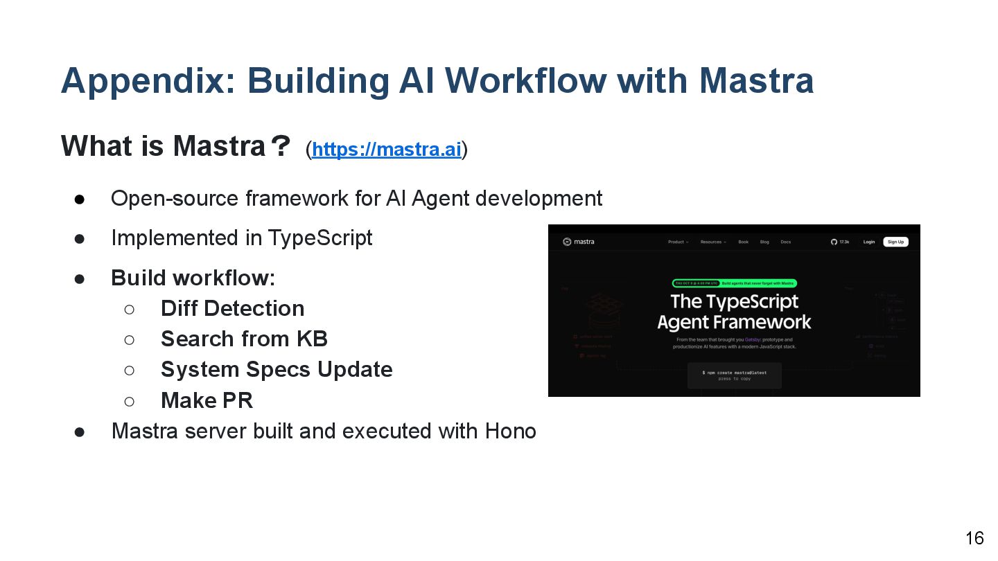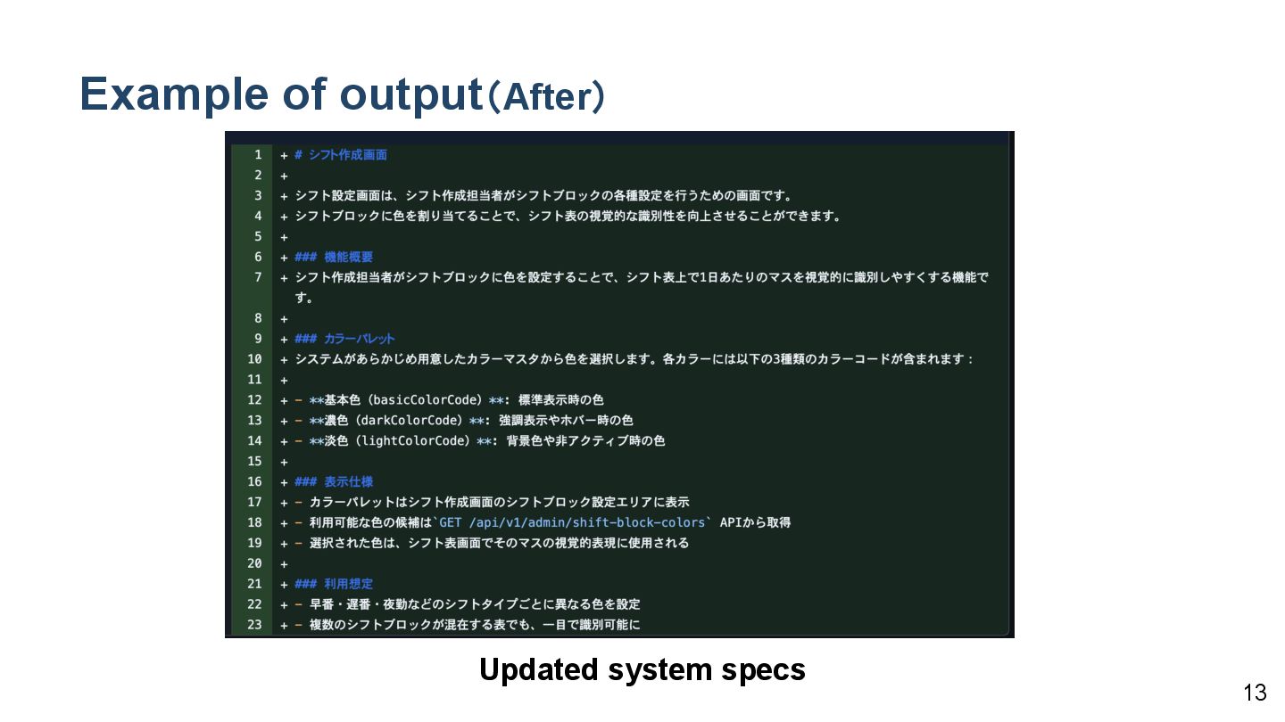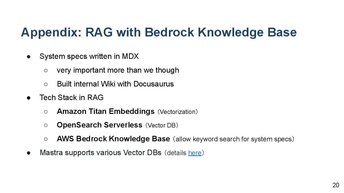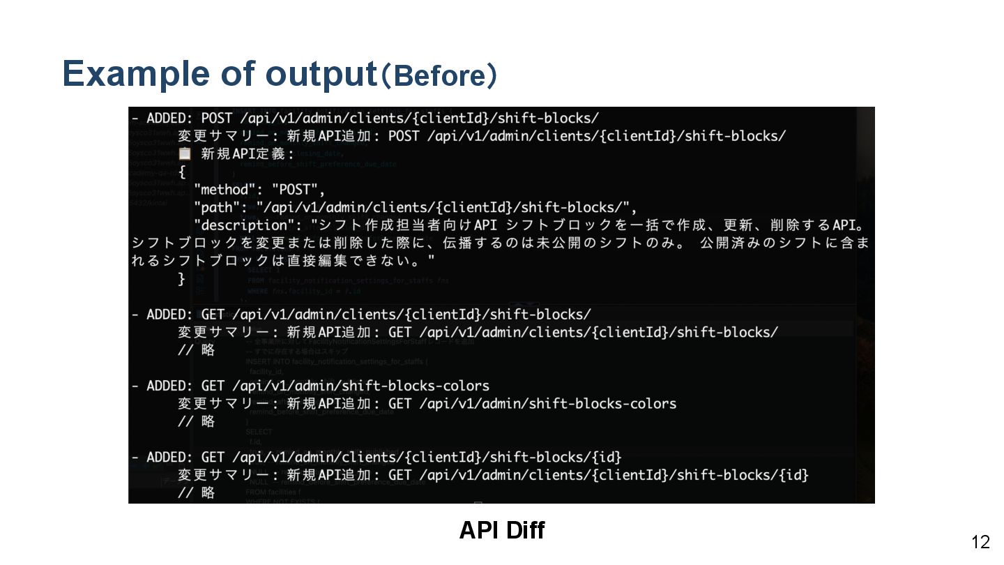 in the API file • Validate values and types with Zod • OpenAPI Swagger Spec is available at /doc endpoint import { OpenAPIHono, createRoute } from '@hono/zod-openapi'; const route = createRoute({ method: 'get', path: '/path', description: 'This is a sample API', request: { params: ParamsSchema, // Zod Schema }, responses: { 200: { content: { 'application/json': { schema: UserSchema, // Zod Schema }, }, description: '200 OK', }, }, }); const app = new OpenAPIHono(); app.openapi(route, (c) => { // API logic should be here }); app.doc('/doc', { openapi: '3.0.0', info: { version: '1.0.0', title: 'Sample API', }, }); Appendix: API Development & API Specs Generation① 17