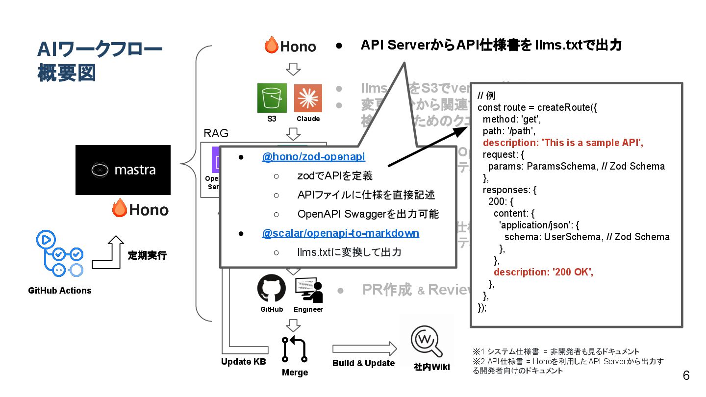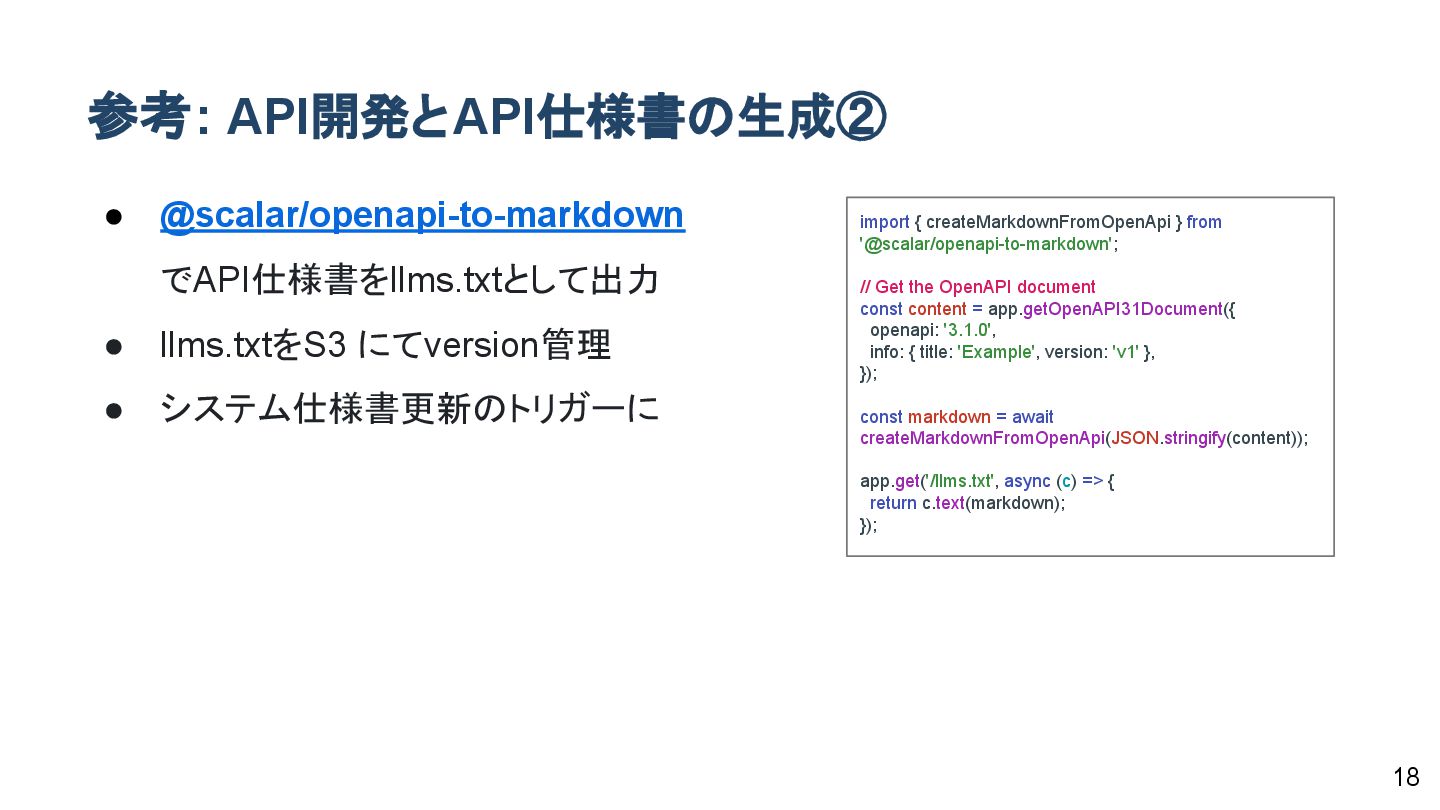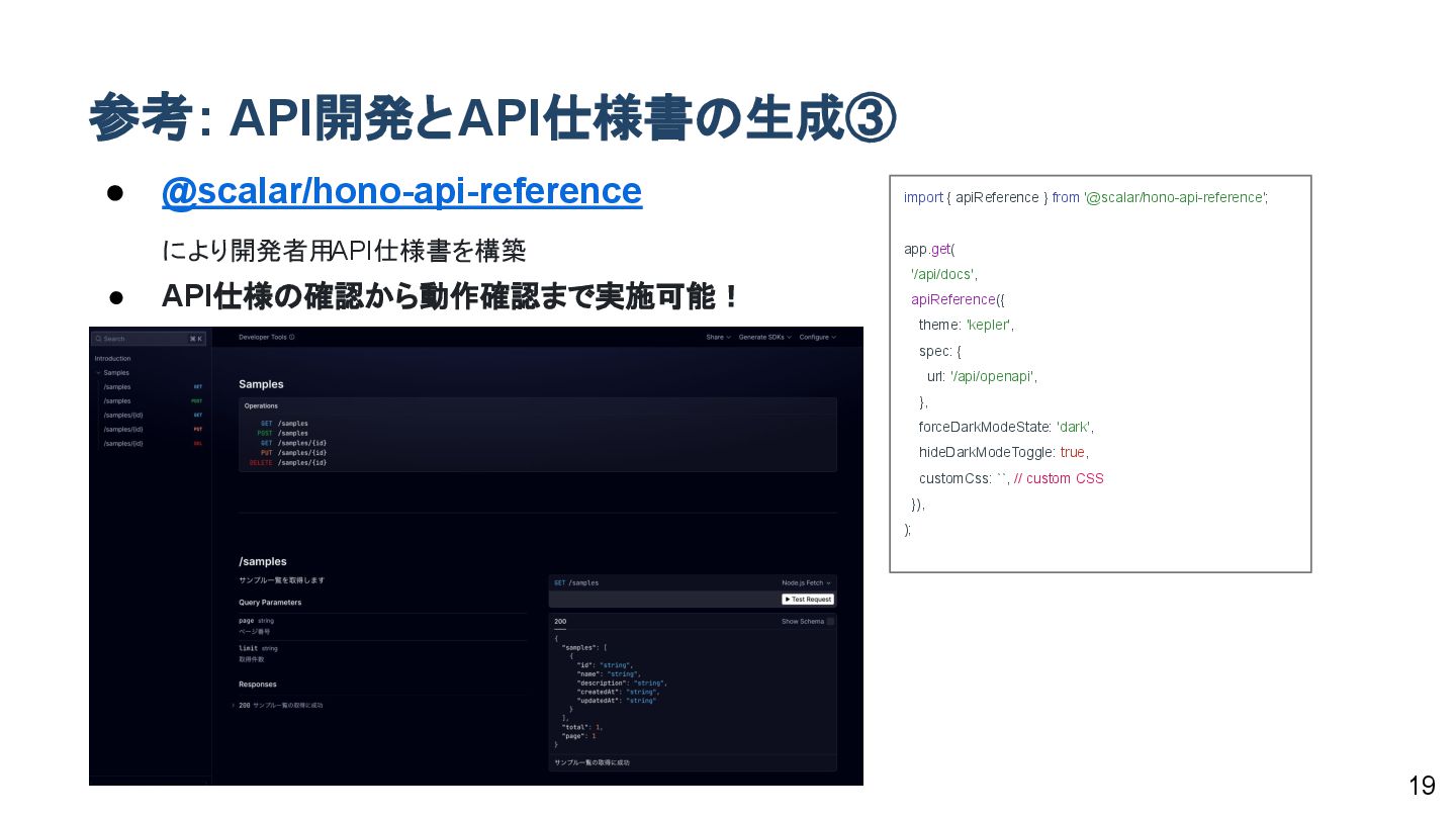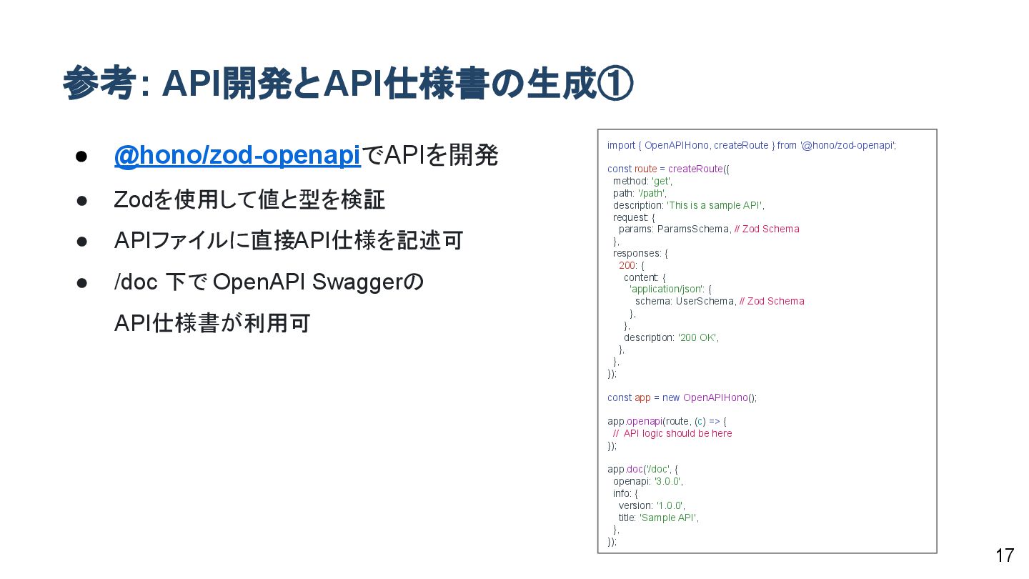 Swaggerの API仕様書が利用可 import { OpenAPIHono, createRoute } from '@hono/zod-openapi'; const route = createRoute({ method: 'get', path: '/path', description: 'This is a sample API', request: { params: ParamsSchema, // Zod Schema }, responses: { 200: { content: { 'application/json': { schema: UserSchema, // Zod Schema }, }, description: '200 OK', }, }, }); const app = new OpenAPIHono(); app.openapi(route, (c) => { // API logic should be here }); app.doc('/doc', { openapi: '3.0.0', info: { version: '1.0.0', title: 'Sample API', }, }); 参考: API開発とAPI仕様書の生成① 17