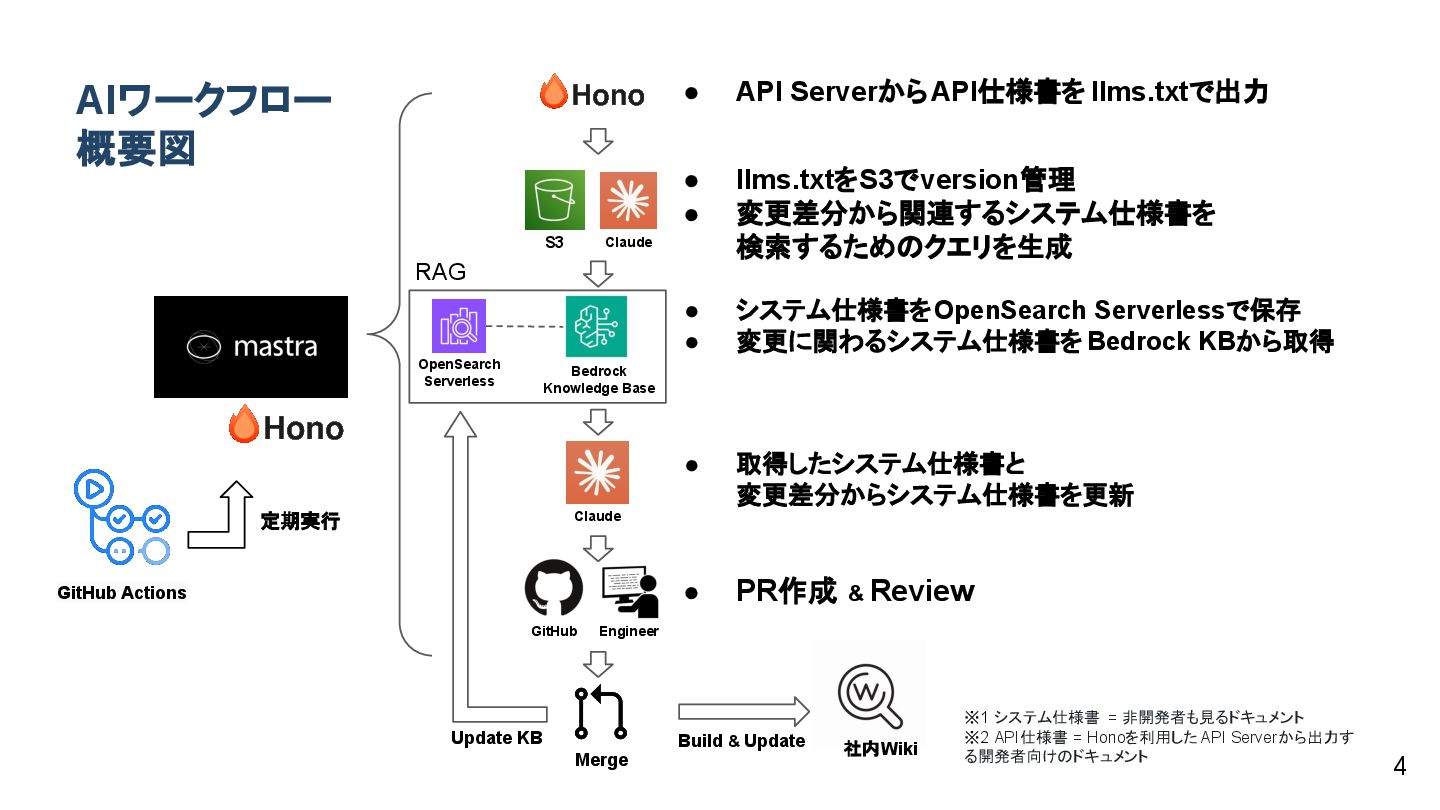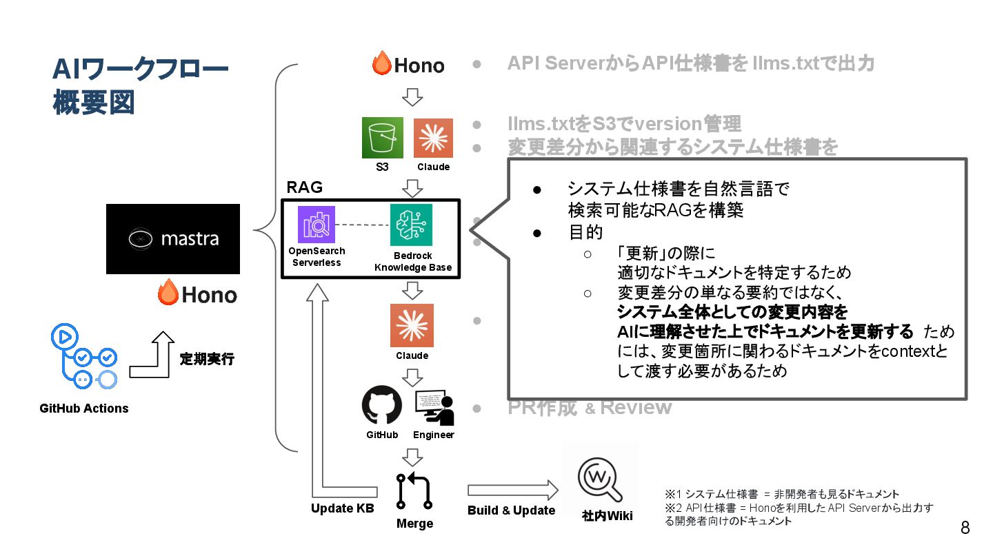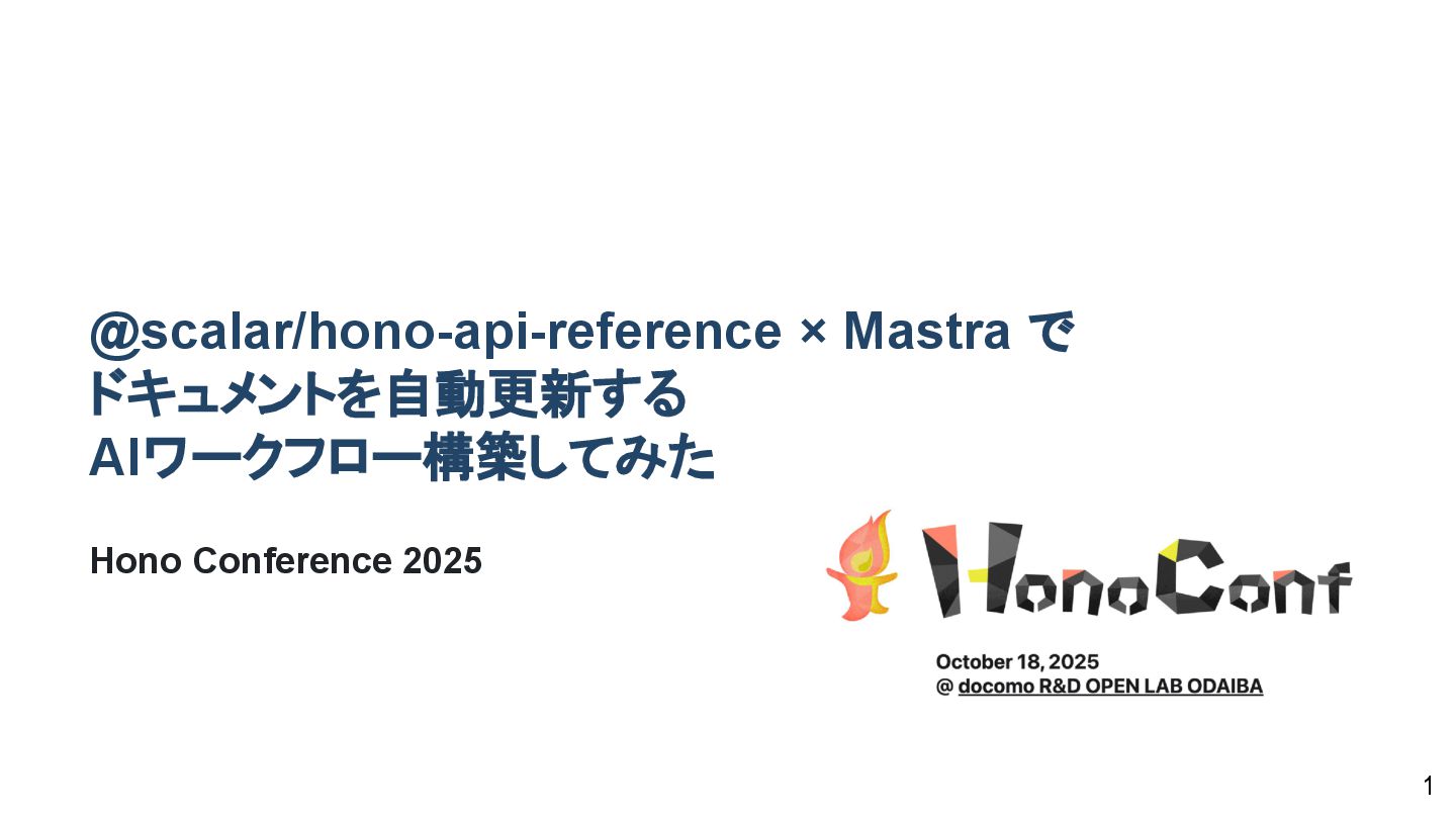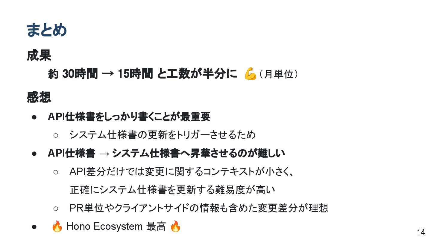 Swaggerの API仕様書が利用可 import { OpenAPIHono, createRoute } from '@hono/zod-openapi'; const route = createRoute({ method: 'get', path: '/path', description: 'This is a sample API', request: { params: ParamsSchema, // Zod Schema }, responses: { 200: { content: { 'application/json': { schema: UserSchema, // Zod Schema }, }, description: '200 OK', }, }, }); const app = new OpenAPIHono(); app.openapi(route, (c) => { // API logic should be here }); app.doc('/doc', { openapi: '3.0.0', info: { version: '1.0.0', title: 'Sample API', }, }); 参考: API開発とAPI仕様書の生成① 17