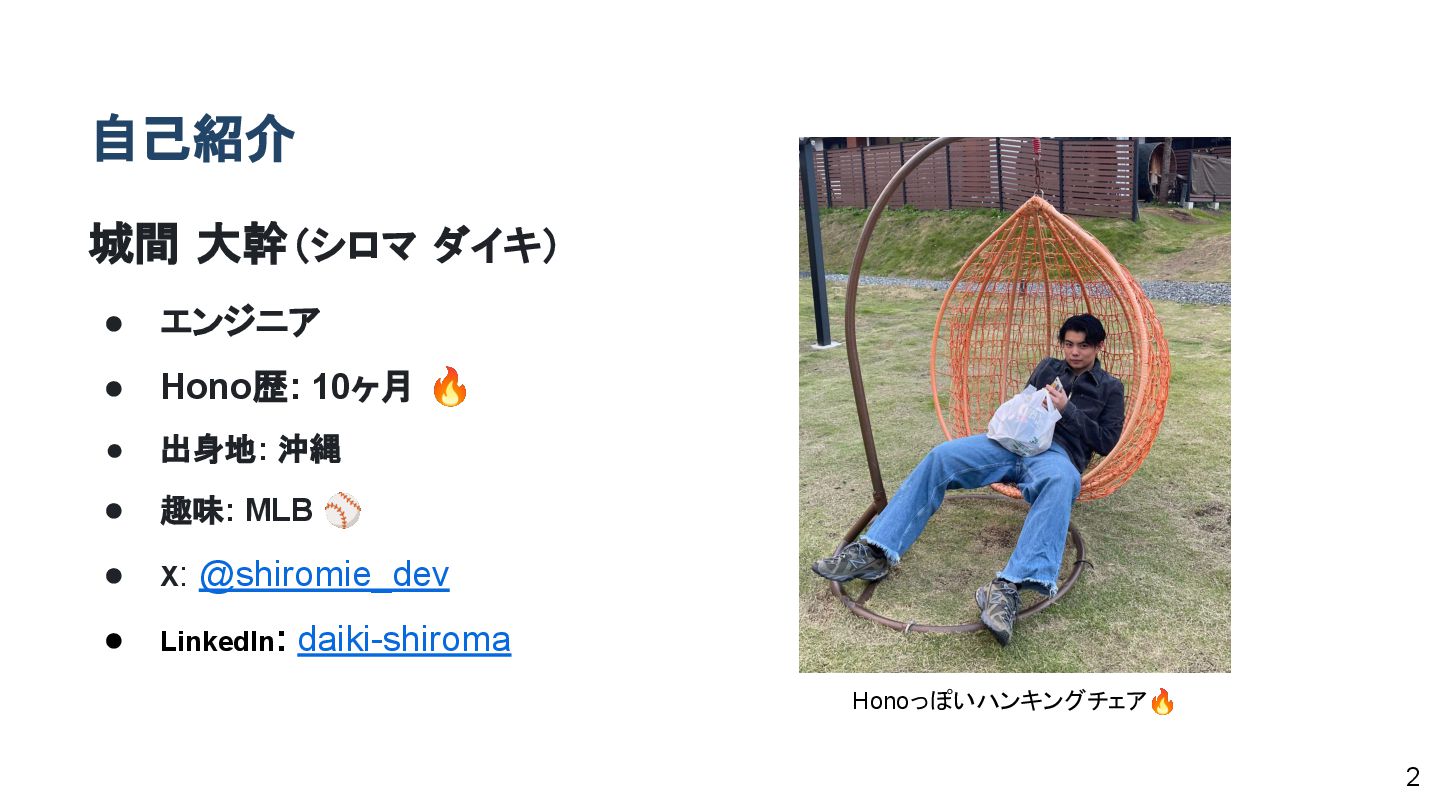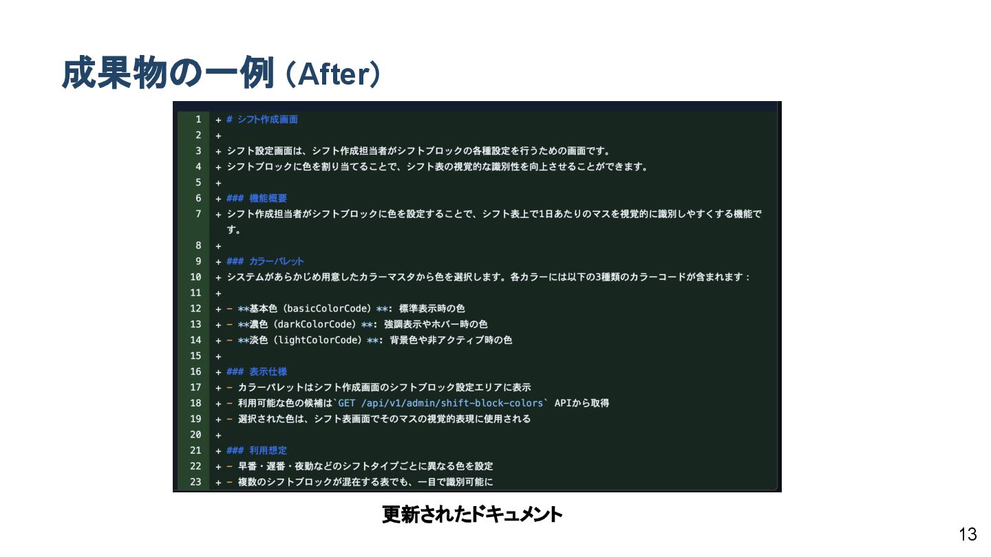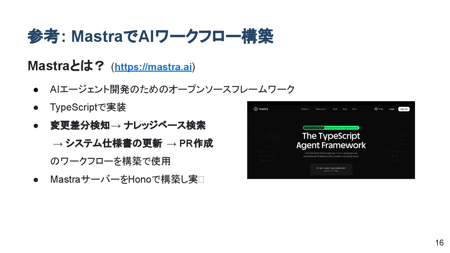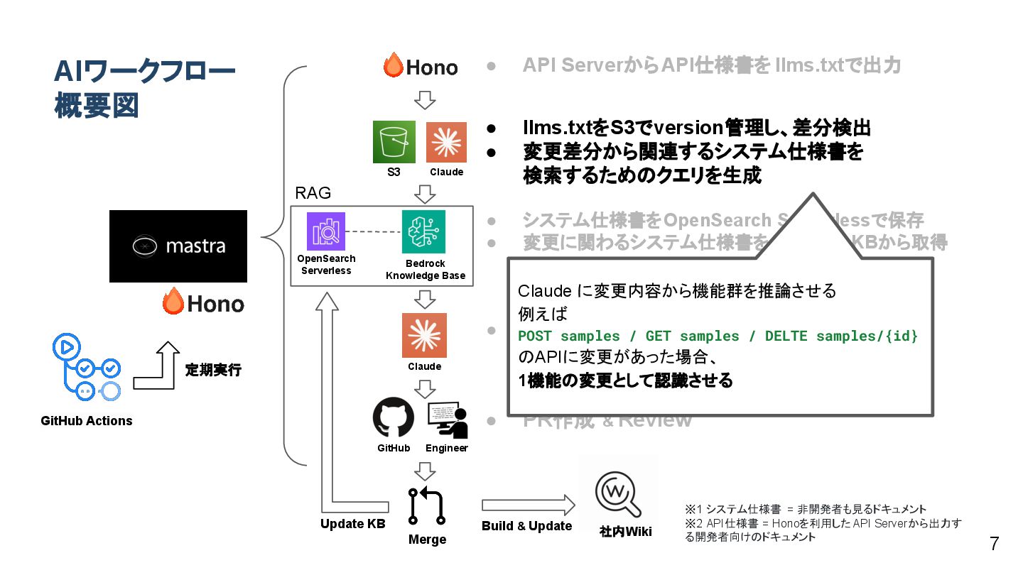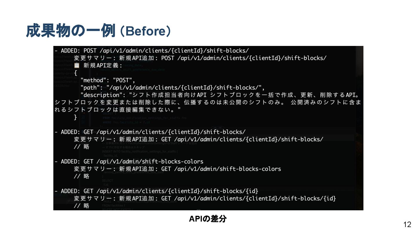 Swaggerの API仕様書が利用可 import { OpenAPIHono, createRoute } from '@hono/zod-openapi'; const route = createRoute({ method: 'get', path: '/path', description: 'This is a sample API', request: { params: ParamsSchema, // Zod Schema }, responses: { 200: { content: { 'application/json': { schema: UserSchema, // Zod Schema }, }, description: '200 OK', }, }, }); const app = new OpenAPIHono(); app.openapi(route, (c) => { // API logic should be here }); app.doc('/doc', { openapi: '3.0.0', info: { version: '1.0.0', title: 'Sample API', }, }); 参考: API開発とAPI仕様書の生成① 17