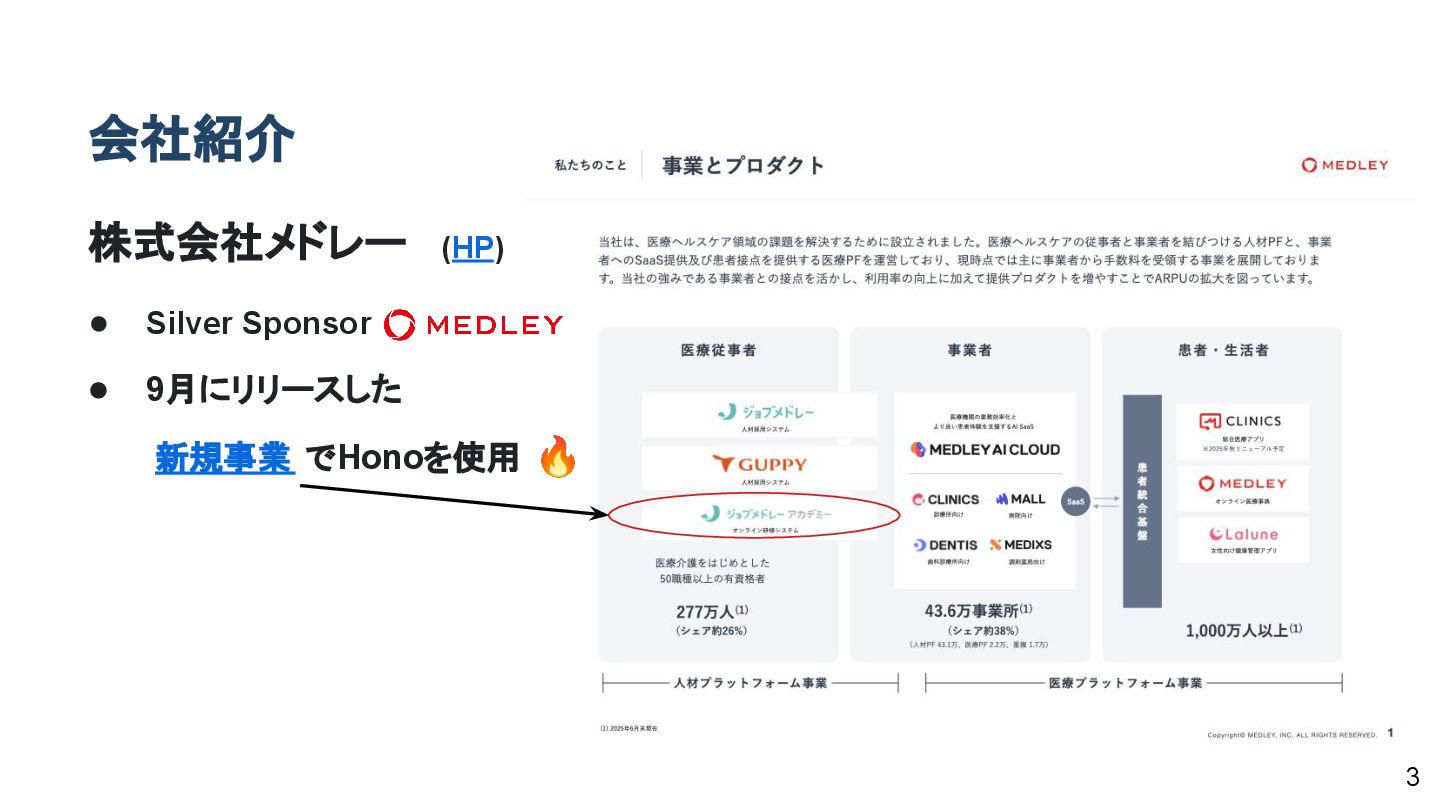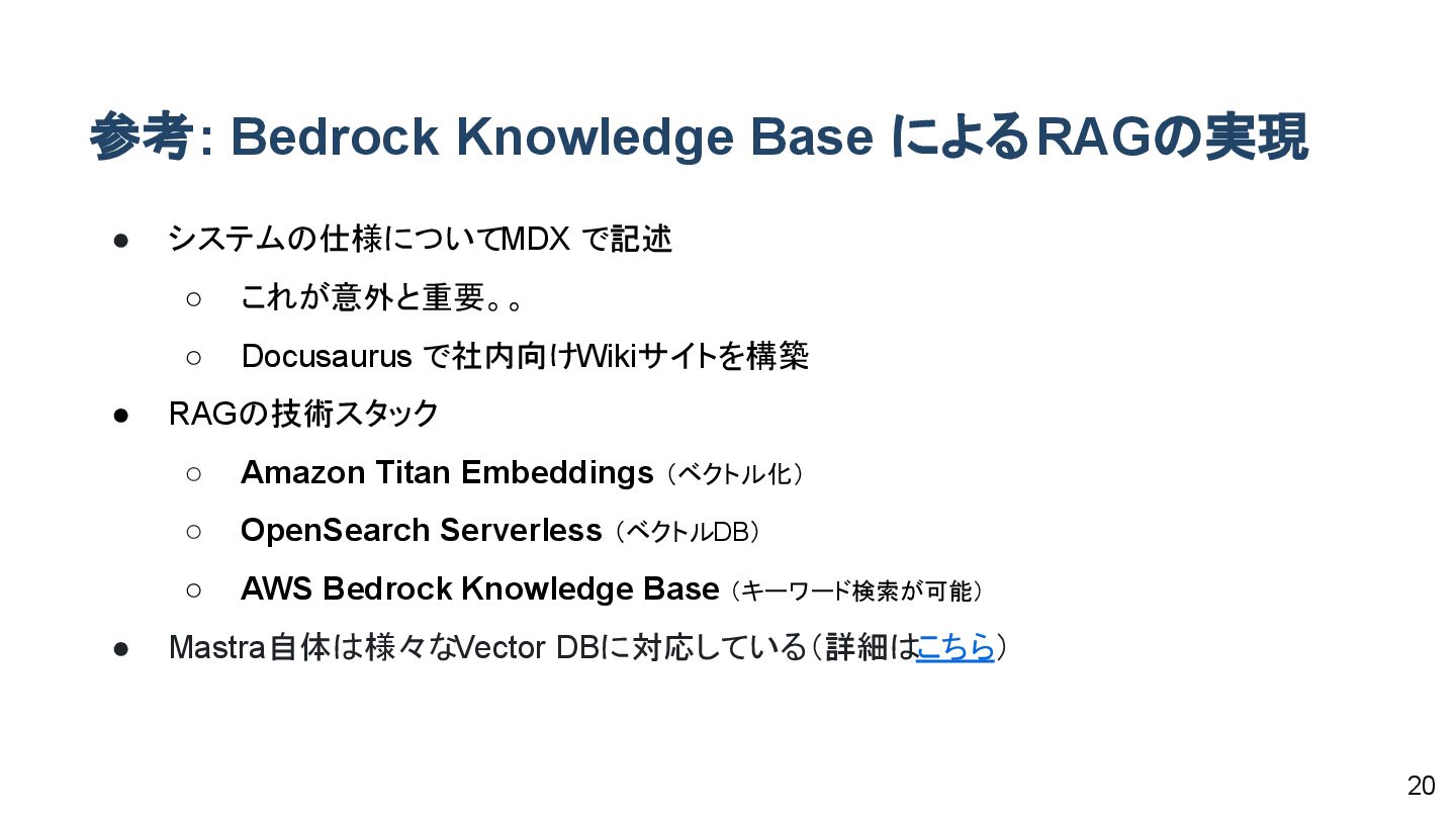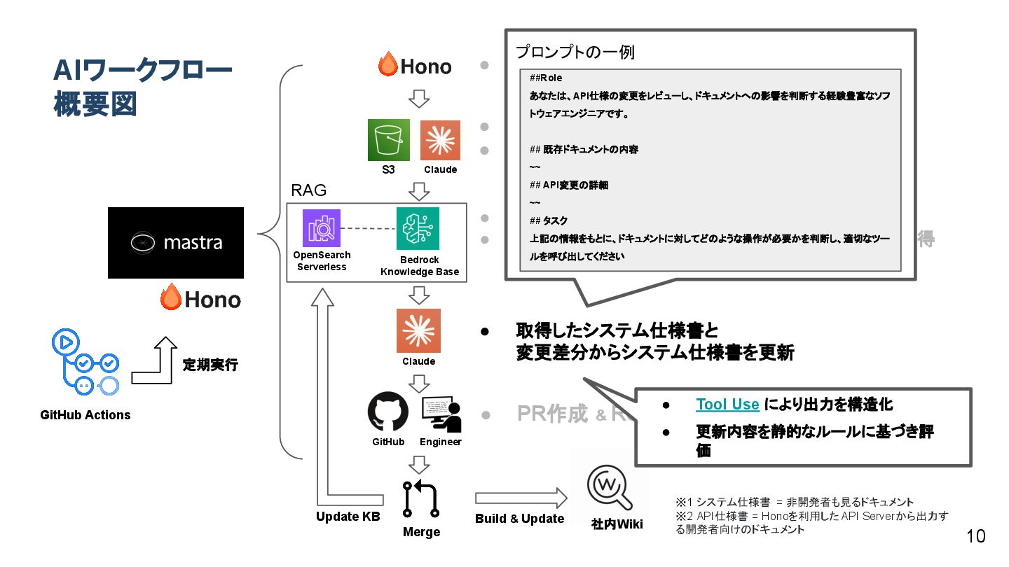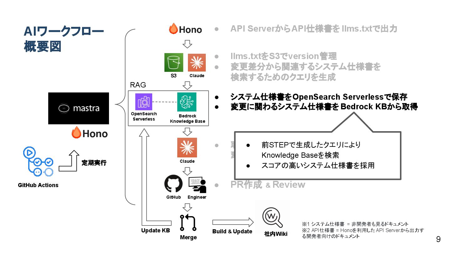 Swaggerの API仕様書が利用可 import { OpenAPIHono, createRoute } from '@hono/zod-openapi'; const route = createRoute({ method: 'get', path: '/path', description: 'This is a sample API', request: { params: ParamsSchema, // Zod Schema }, responses: { 200: { content: { 'application/json': { schema: UserSchema, // Zod Schema }, }, description: '200 OK', }, }, }); const app = new OpenAPIHono(); app.openapi(route, (c) => { // API logic should be here }); app.doc('/doc', { openapi: '3.0.0', info: { version: '1.0.0', title: 'Sample API', }, }); 参考: API開発とAPI仕様書の生成① 17