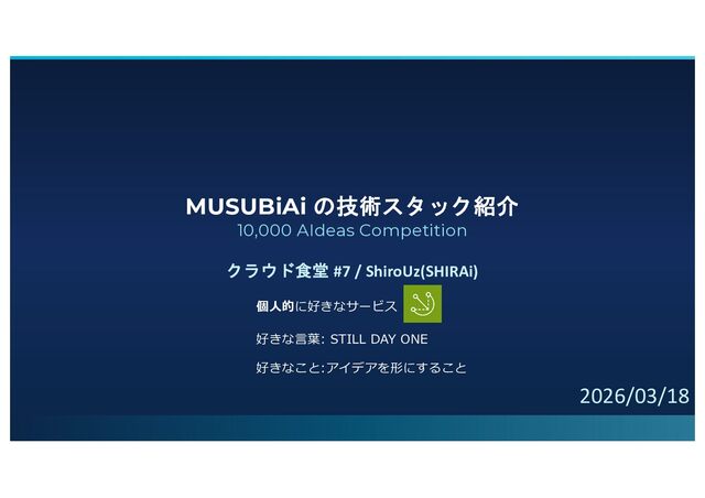 MUSUBiAi の技術スタック紹介 10,000 AIdeas Competition クラウド食堂 #7 / ShiroUz(SHIRAi) 2026/03/18