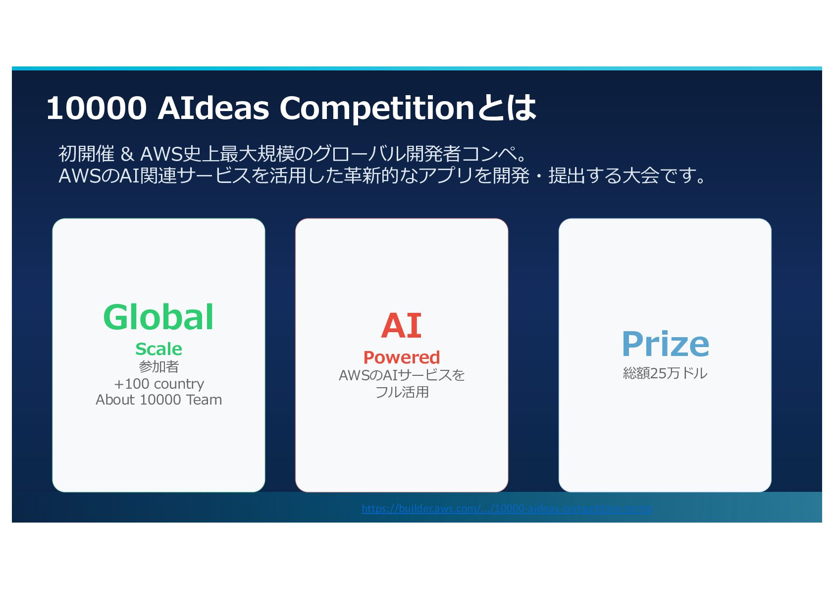 Powered AWSのAIサービスを フル活⽤ Global Scale 参加者 +100 country About 10000 Team https://builder.aws.com/.../10000-aideas-competition-terms