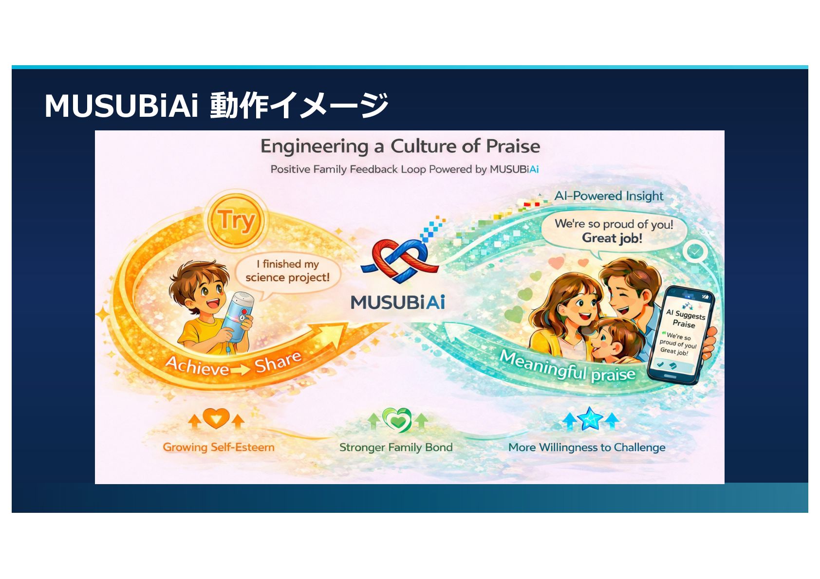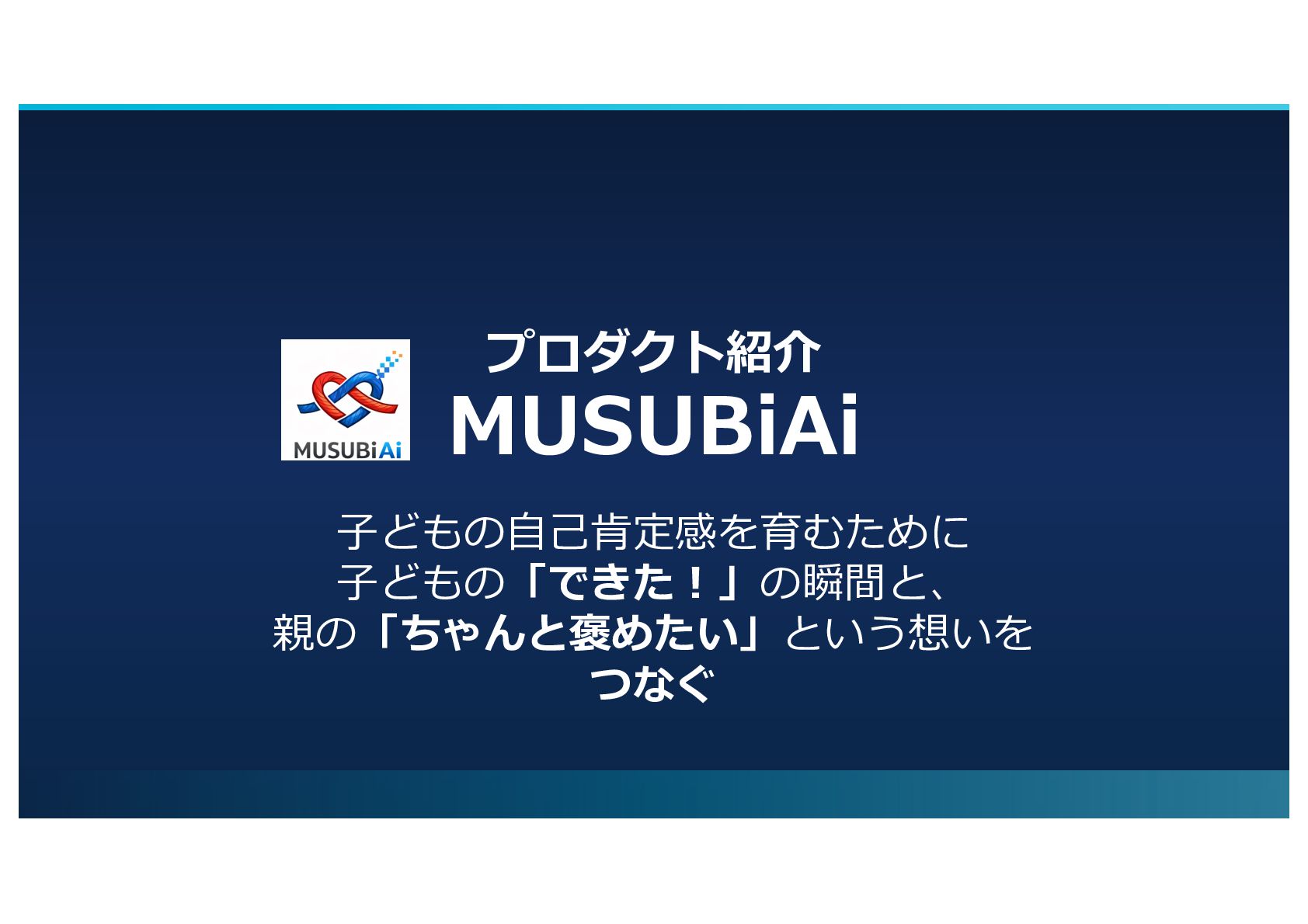 プロダクト紹介 MUSUBiAi ⼦どもの⾃⼰肯定感を育むために ⼦どもの「できた︕」の瞬間と、 親の「ちゃんと褒めたい」という想いを つなぐ